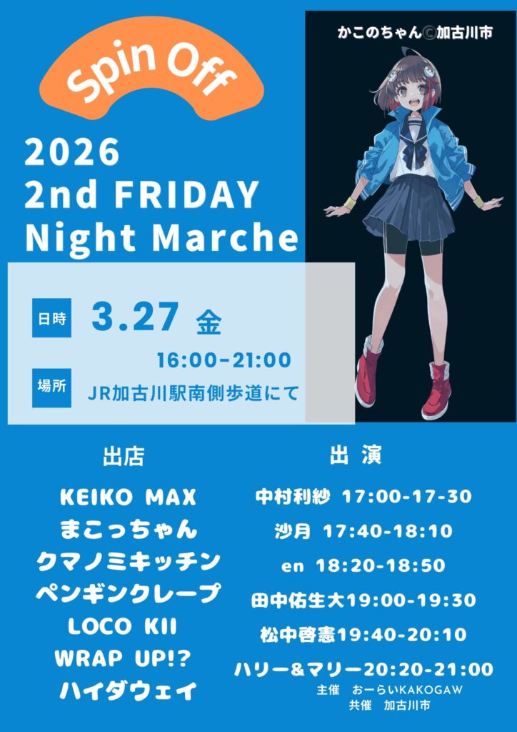 2026年3月27日(金)、加古川駅前南側歩道(加古川駅南広場)にて、2nd Friday Night Marcheが開催されます! 開催時間は16時から21時まで。 特別に第4金曜日に開催さ...