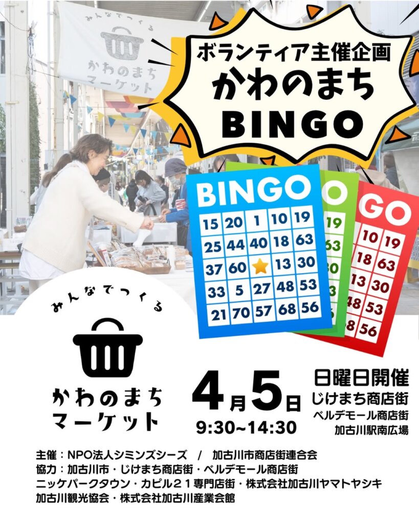 4/5(日)かわのまちマーケットがじけまち商店街・ベルデモール商店街・加古川駅南広場で開催!60店舗が出店予定!ビンゴ大会も!