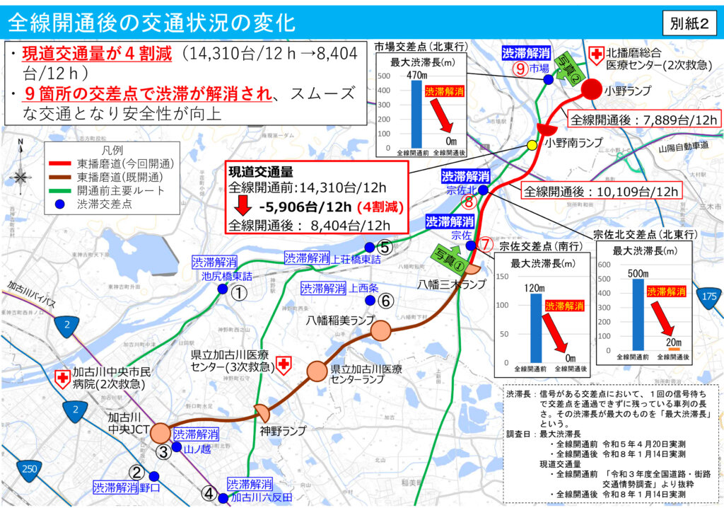 東播磨道の全線開通で交通改善!加古川〜小野の移動時間が17分短縮、渋滞9交差点が解消