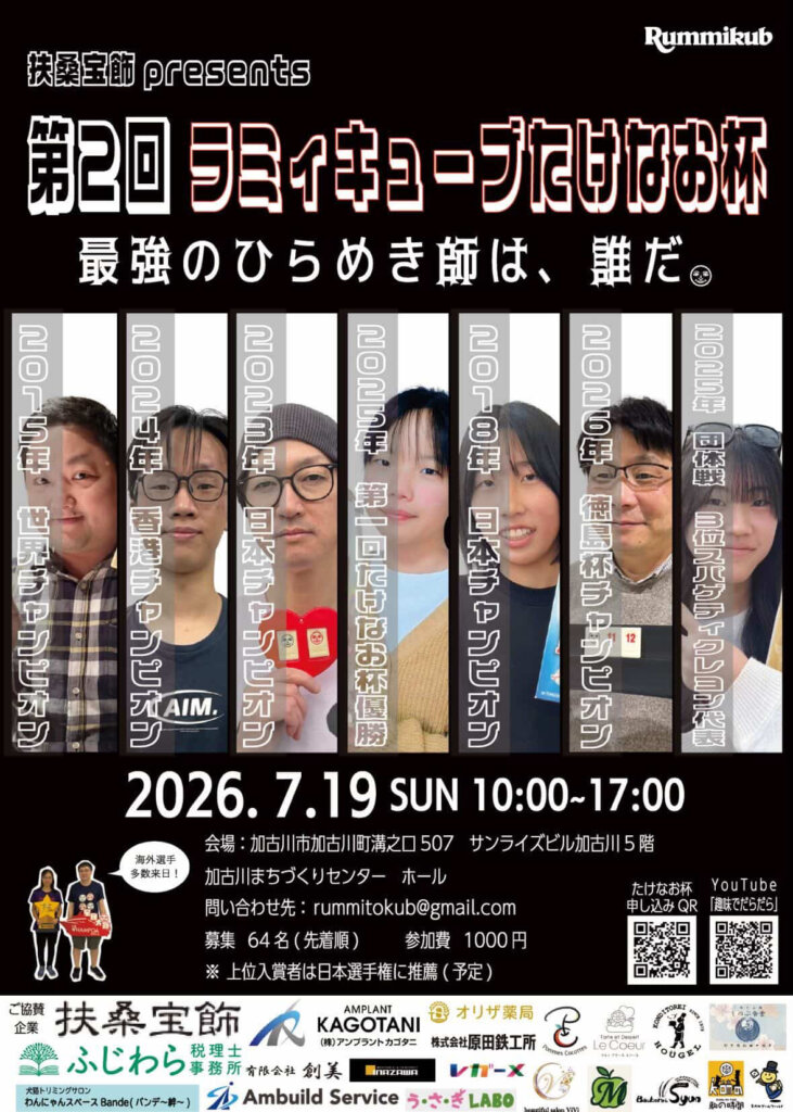 7/19(日)扶桑宝飾presents第2回ラミィキューブたけなお杯が加古川まちづくりセンター ホールにて開催!参加者募集中!2026年7月19日(日)、サンライズ加古川ビル5階の加古川まちづくりセンター ホールにて、扶桑宝飾presents第2回ラミィキューブたけなお杯が開催されます! 開催時間は1... -