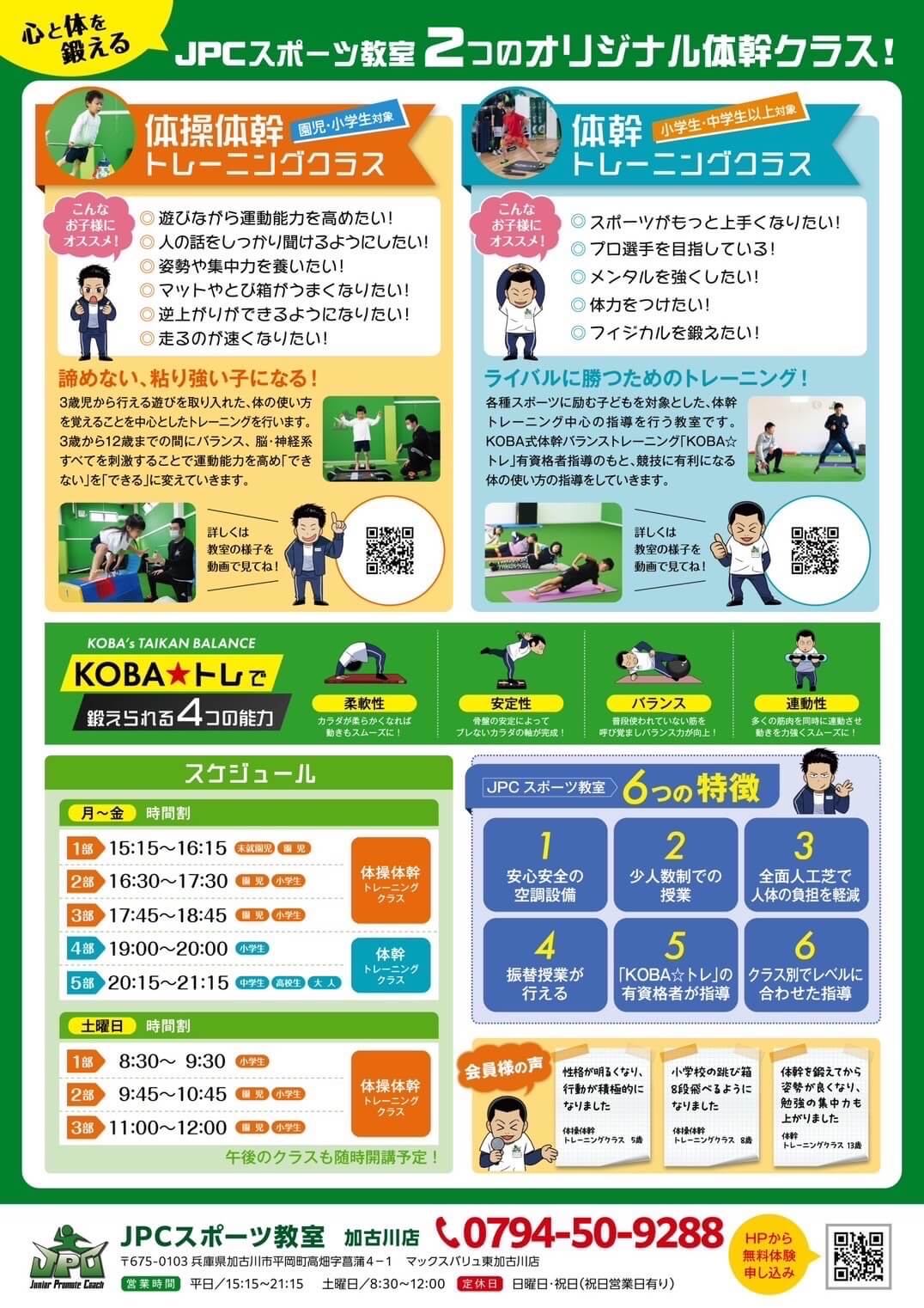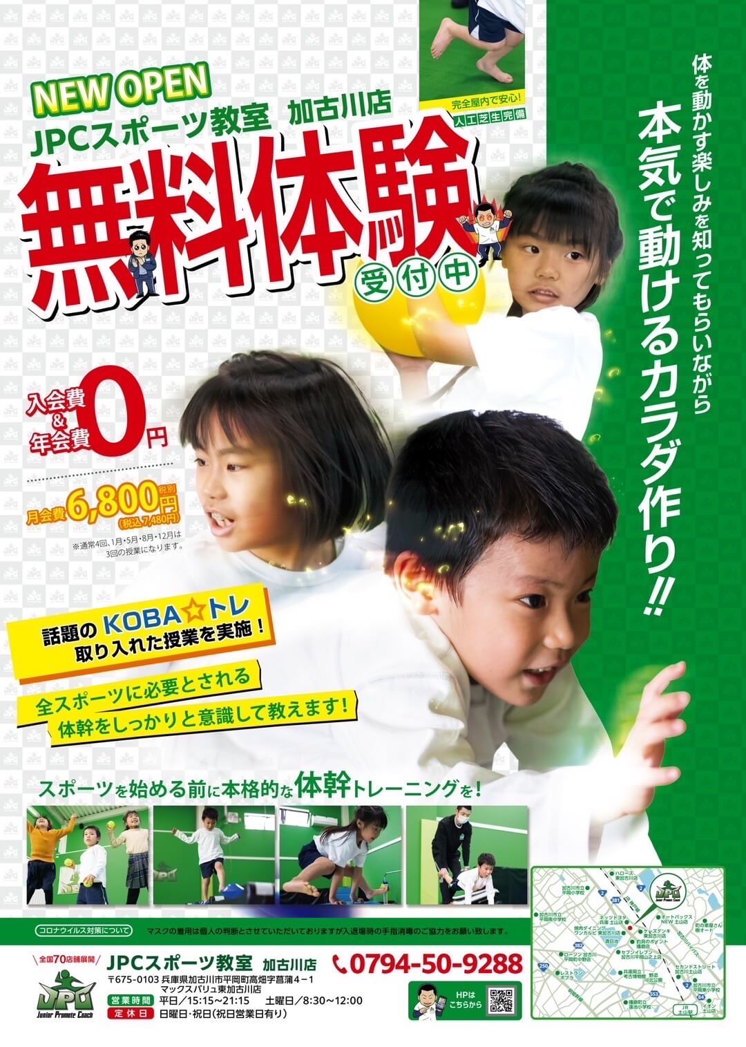 平岡町高畑のイオンタウン東加古川ショッピングセンターにある体幹に特化した体操教室、JPCスポーツ教室 加古川店で無料体験受付中です!