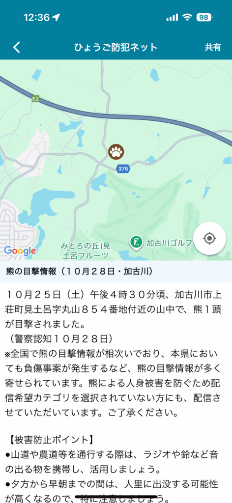 10/25(土)に加古川北部(上荘町見土呂)で熊1頭の目撃があったそうです【2025】