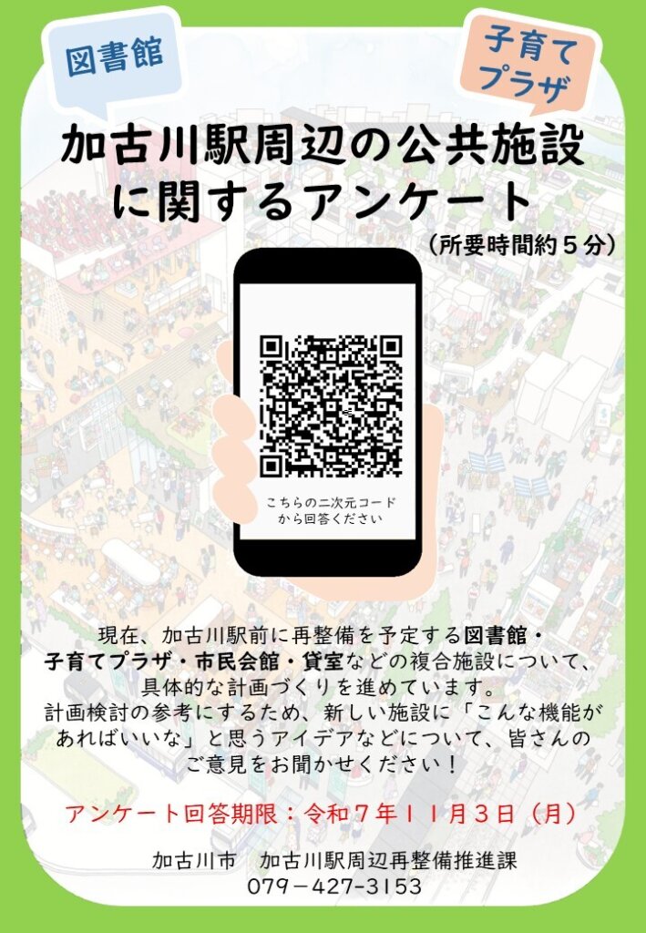 加古川市が加古川駅周辺の公共施設に関するアンケートを実施しています。回答締切は2025年11月3日(月・祝)まで。 加古川市HPより 加古川駅周辺の再整備に向けて、令和...