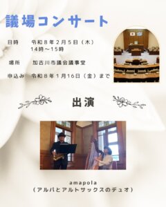 開場は13時半、14時開演。終演予定は15時の1時間のコンサートです。