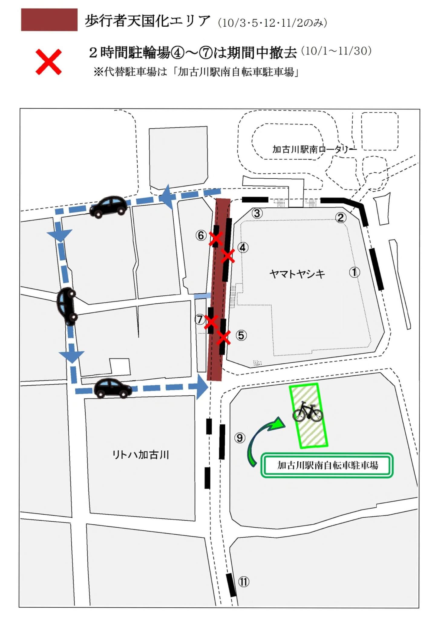 社会実験に伴う駐輪場の撤去と、歩行者天国に伴う交通規制は以下のとおりとなっています。