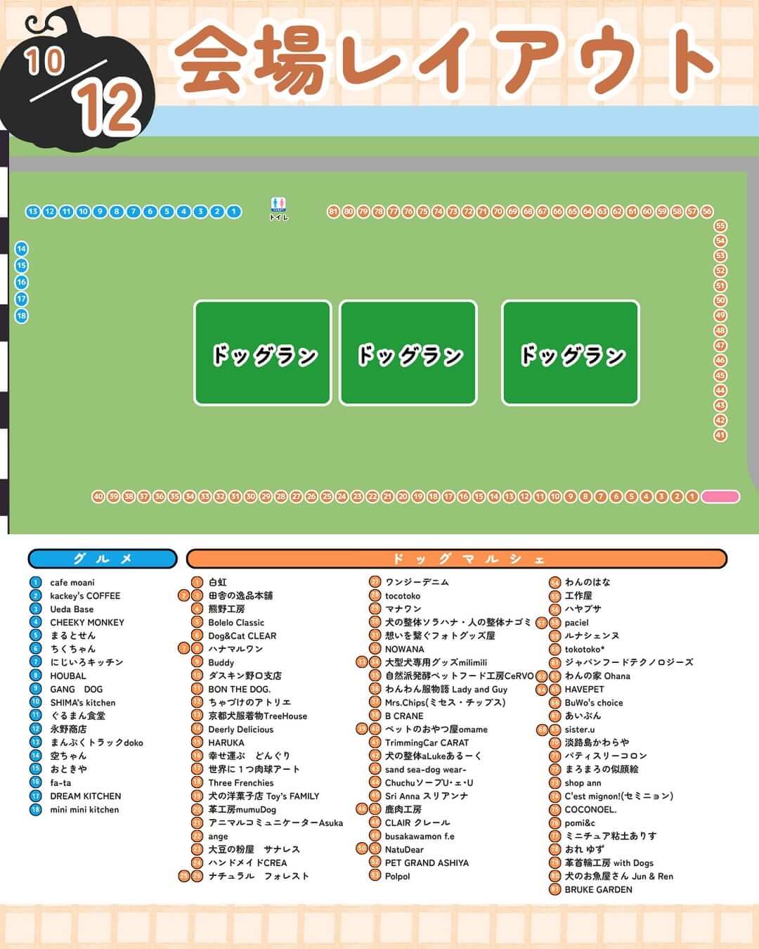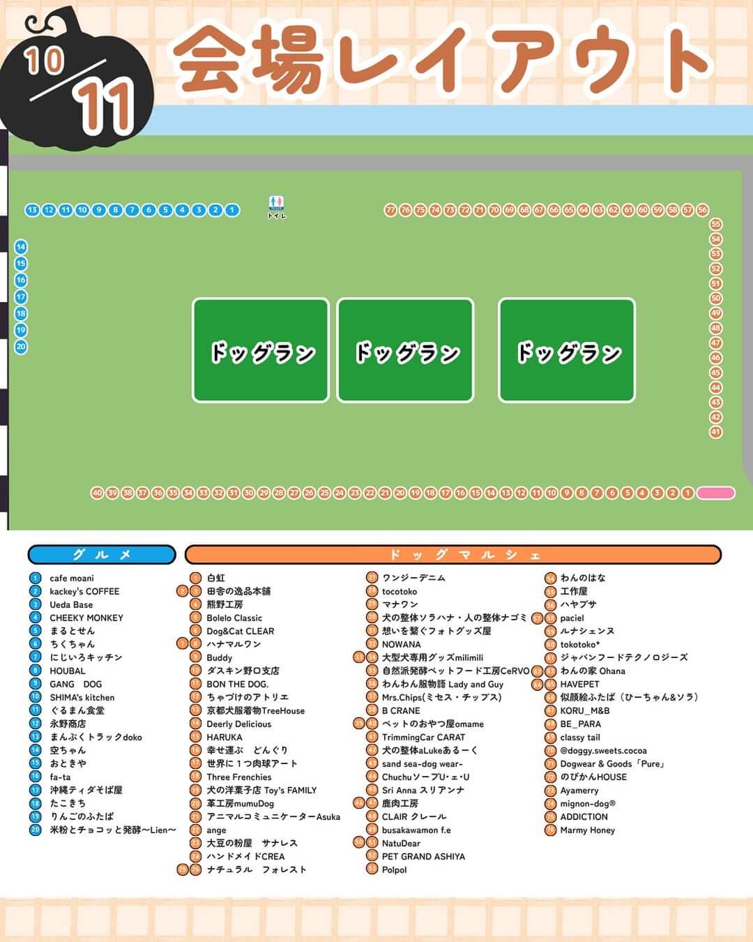 会場レイアウトと出店者は1日目と2日目で以下の内容となる予定です! 出店者の詳細は公式Instagram(@cocoasu_dog_fes)に投稿されているので、参考にしてみてください!