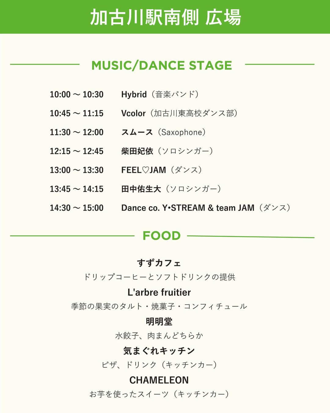 加古川駅南側広場では、音楽×ダンスのステージイベントと飲食ブースが楽しめます!