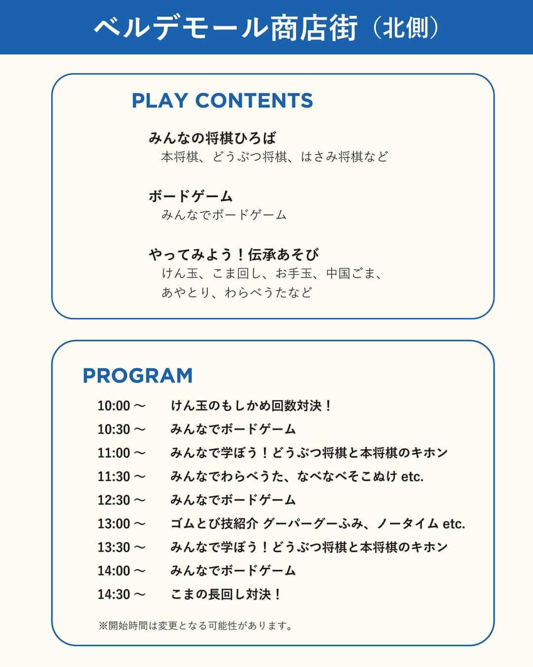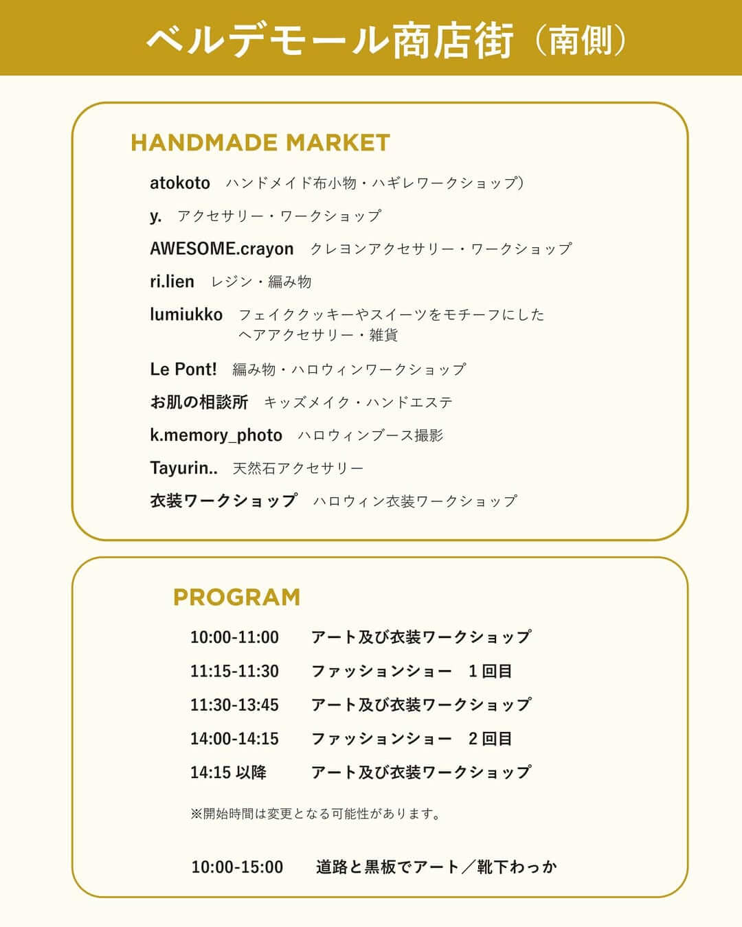ベルデモール商店街は加古川ヤマトヤシキの西側のエリアが歩行者天国となり、北側ではさまざまな遊びが、南側ではアート×ファッションのイベントやハンドメイドブース出店が予定されています。