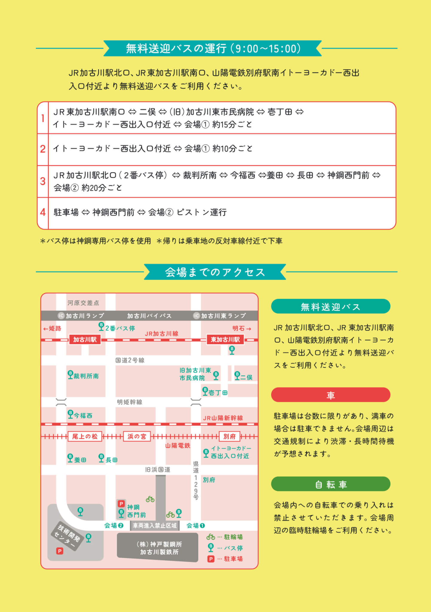 JR加古川駅北口、JR東加古川駅南口、山陽電鉄別府駅南イトーヨーカドー西出入口付近から会場までの無料送迎バスが午前9時から午後3時まで、随時運行予定です。