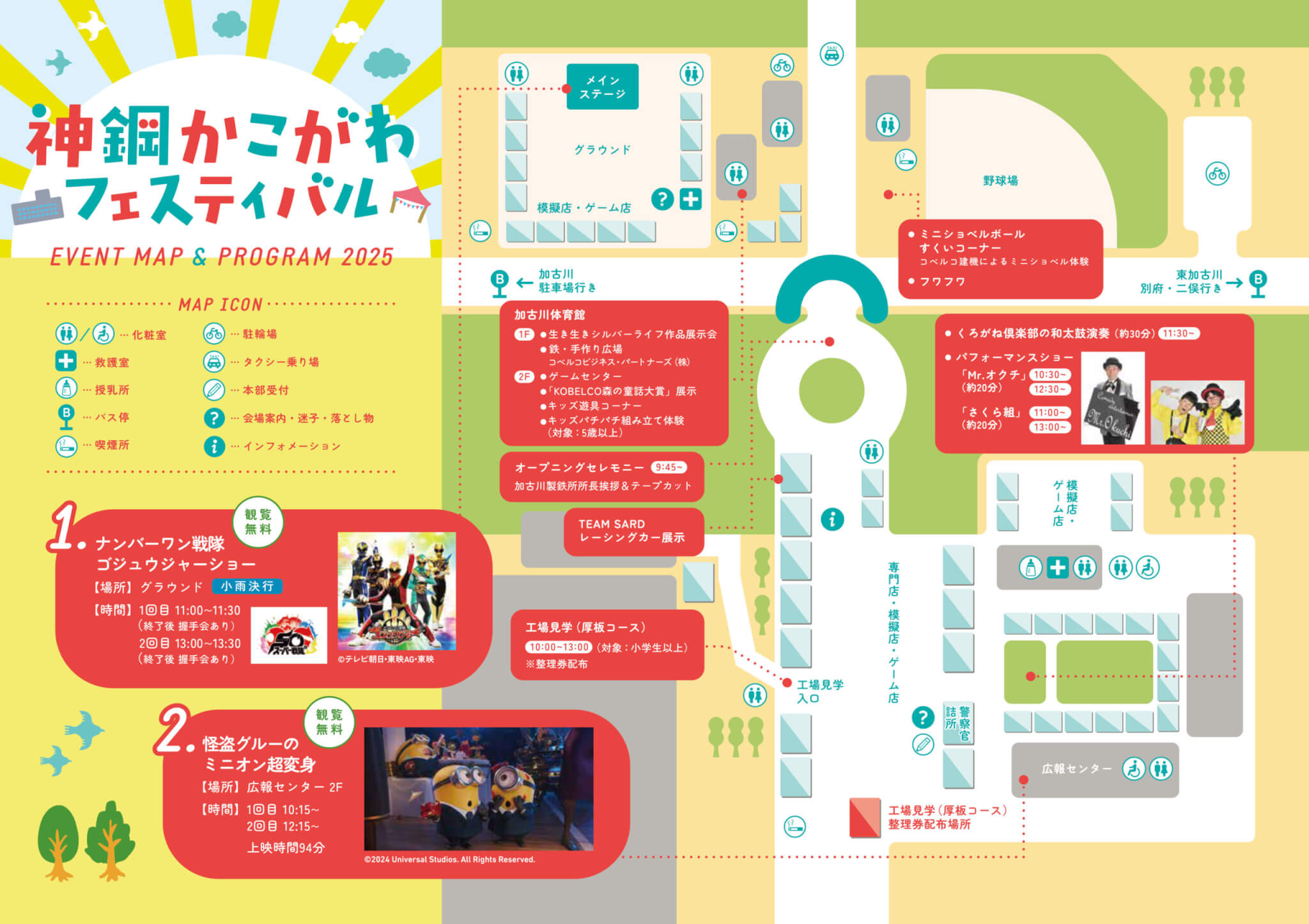 従業員の方や地域の方による模擬店・専門店・ゲーム店などの出店が楽しめるほか、ナンバーワン戦隊ゴジュウジャーショーや怪盗グルーのミニオン超変身の上映などもあります。