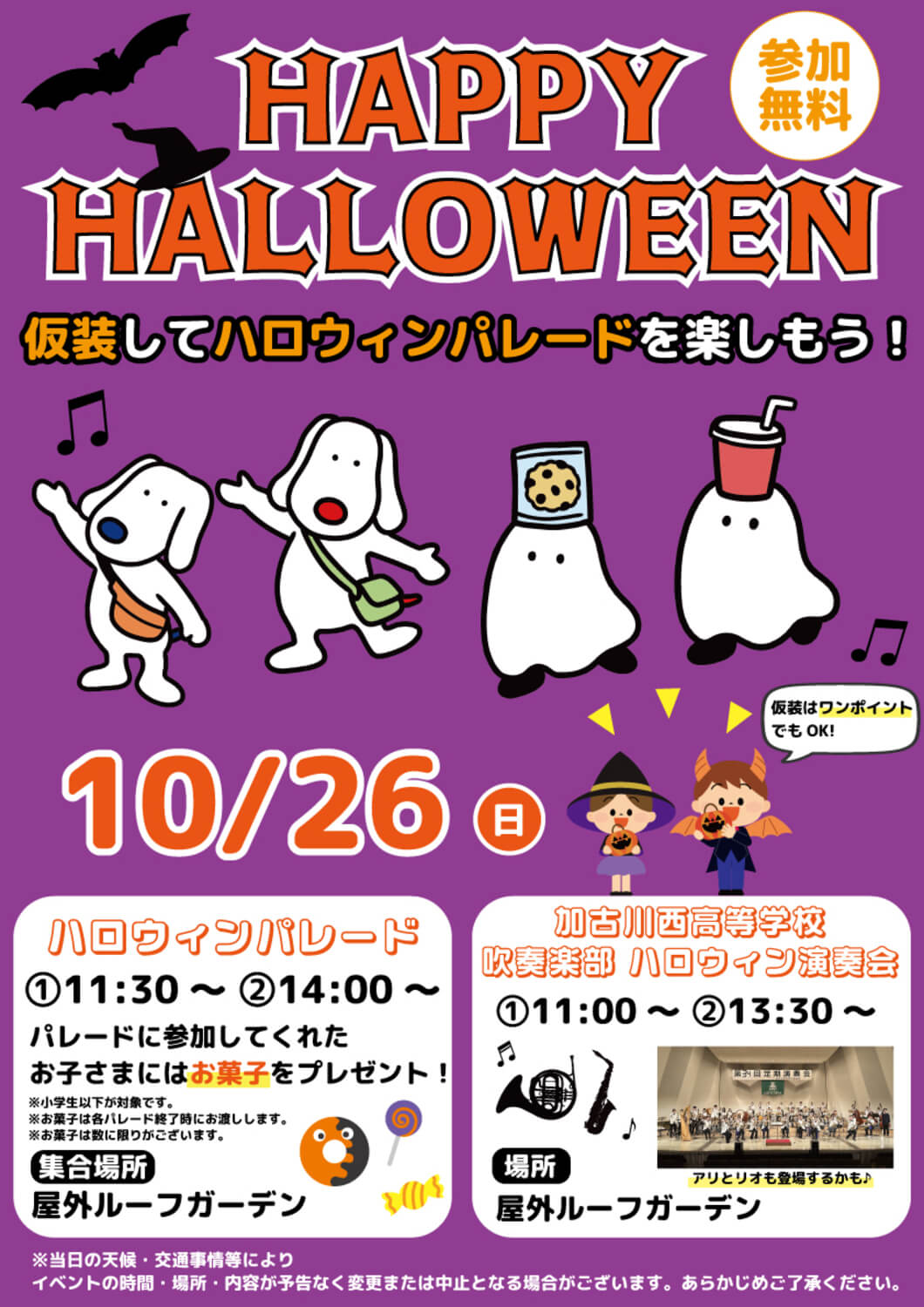 ハロウィン演奏会(①11:00~②13:30~)。ハロウィンパレード(①11:30~②14:00~)。屋外ルーフガーデンにて。アリオ加古川でハロウィンパレードを開催!パレードに参加してくれたお子さまにお菓子をプレゼント!