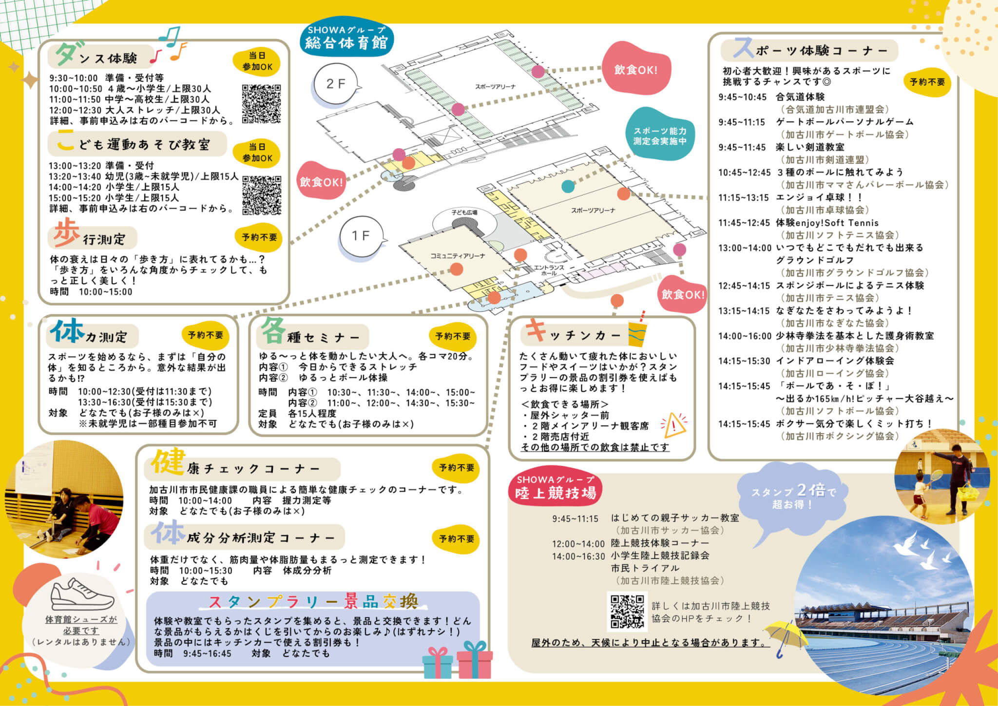 体力測定、体成分分析測定といった自分の体を知るコーナーから、やったことのないスポーツに気軽にチャレンジできる体験コーナーまで盛りだくさん!