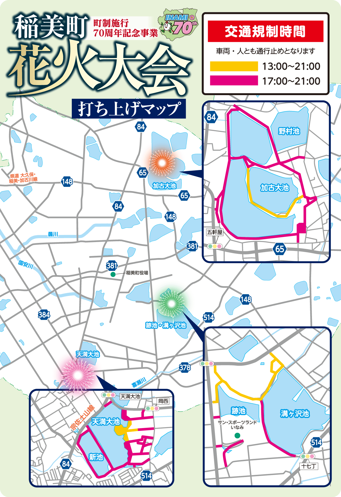 稲美町花火大会専用ホームページで打ち上げマップが公開されています。打ち上げ場所周辺では交通規制も行われ、車両・人とも通行止めとなるエリアがあります。