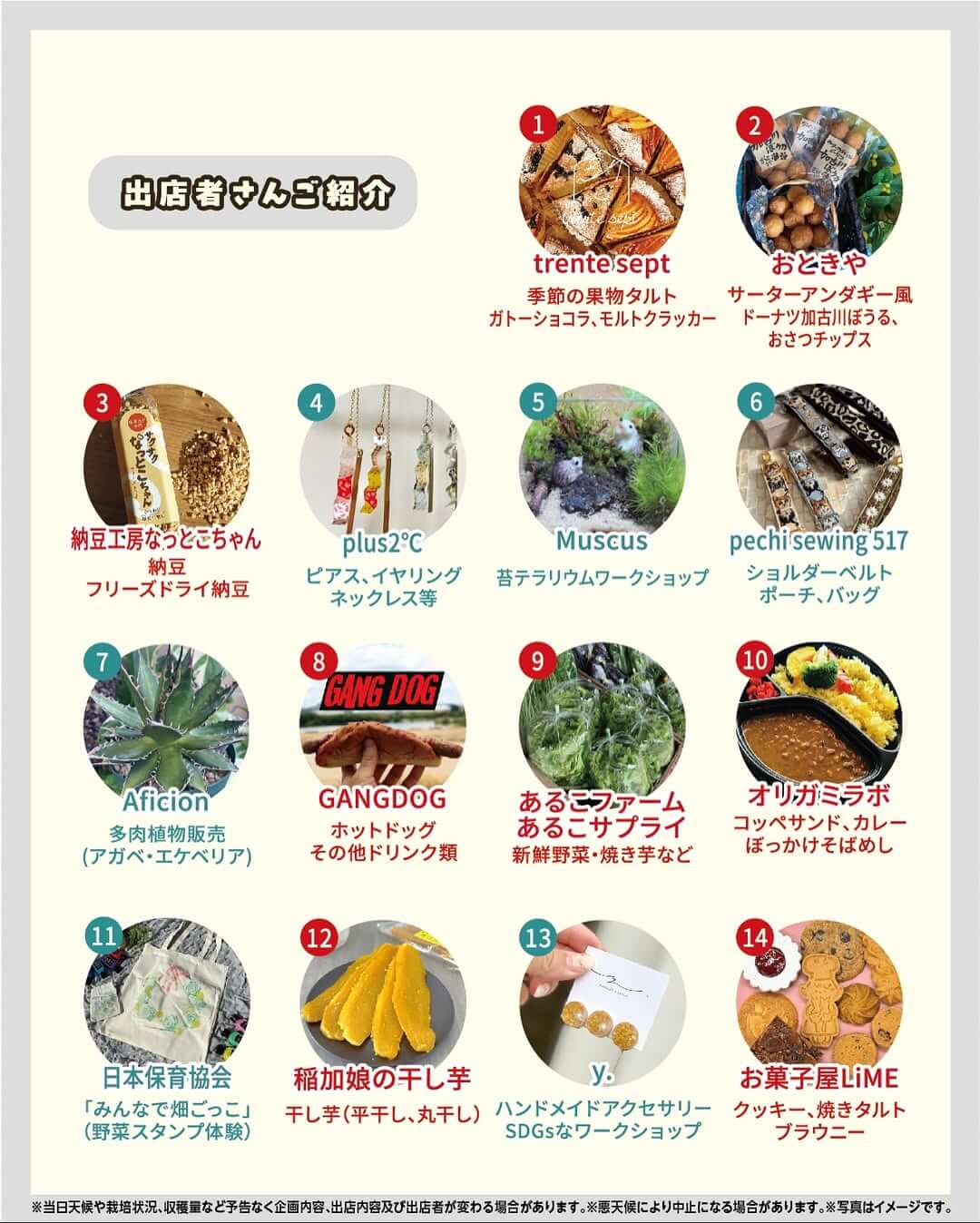 お野菜やこだわりのフード、焼き菓子、アクセサリー、駄菓子、スーパーボールすくいなど大集合!