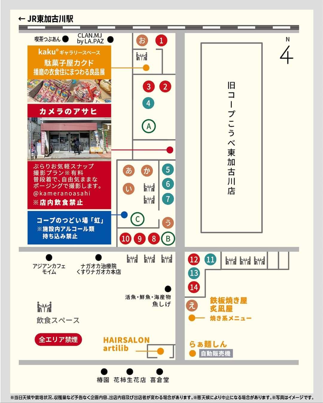 コーヒースタンド&ギャラリースペースのカクドや旧コープこうべ東加古川店のあたりです。