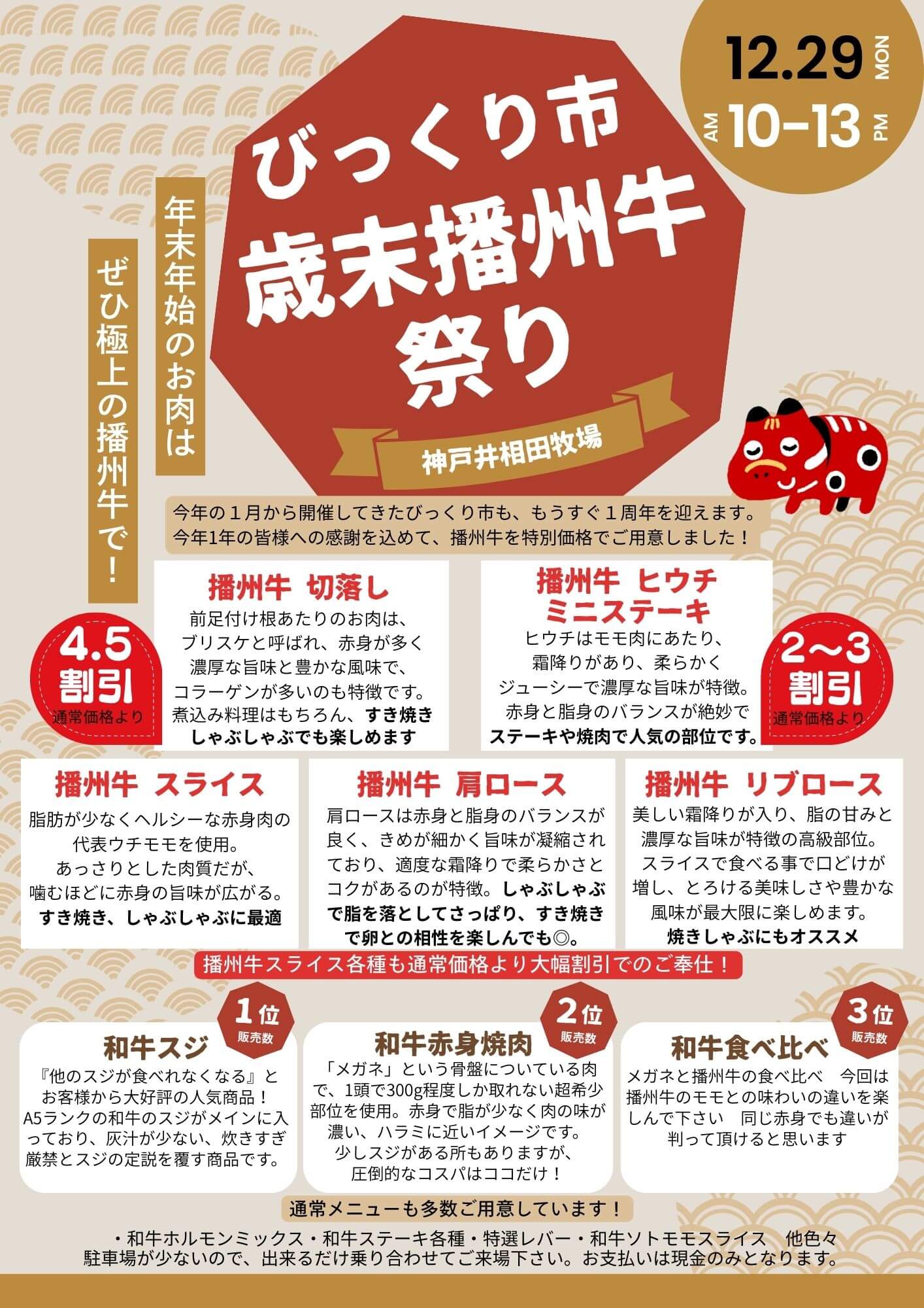 12/29(月)びっくり市歳末播州牛祭りが加古川市上荘町の神戸井相田牧場で開催!年末年始のお肉が安い!