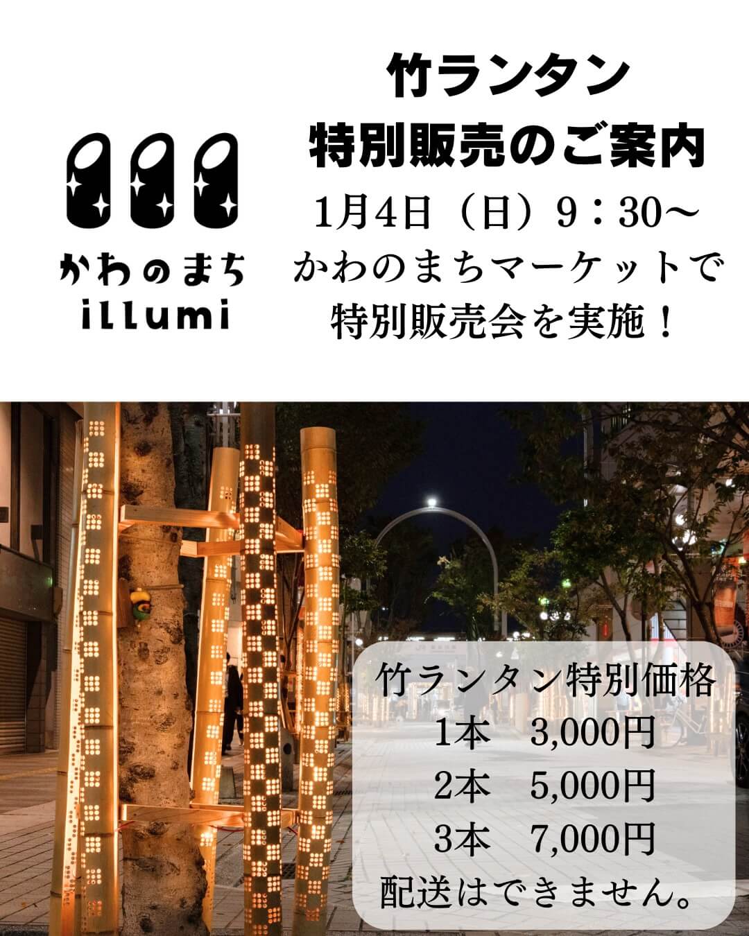 また、2025年末に終了したかわのまちイルミで使用した竹ランタンの特別販売が行われます。電気はセットになっていませんが、長さや絵柄を選んで購入できます。売上は次回のかわのまちイルミの運営資金になるそうです。