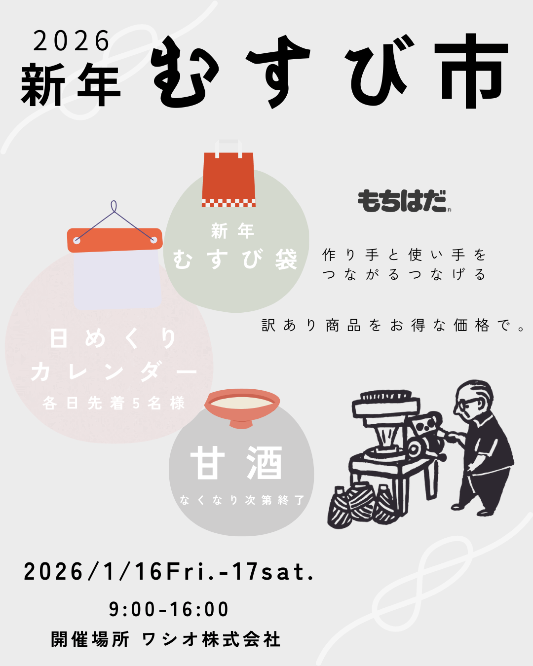 1/16(金)1/17(土)むすび市 at ワシオ株式会社本社(もちはだ直営店)