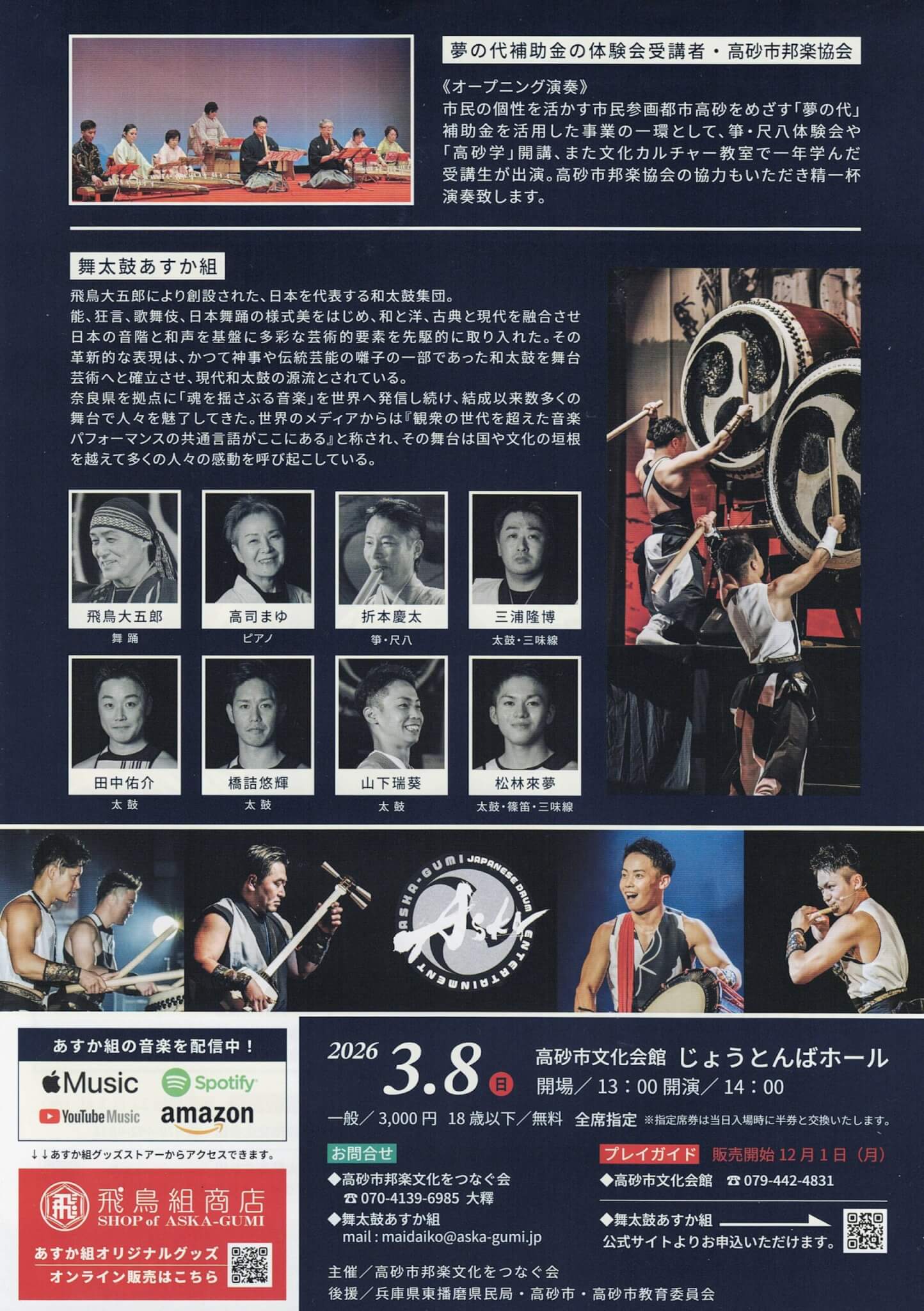 2026年3月8日(日)、高砂市文化会館じょうとんばホールにて、舞太鼓あすか組 in 高砂が開催されます! 13時開場、14時開演。
