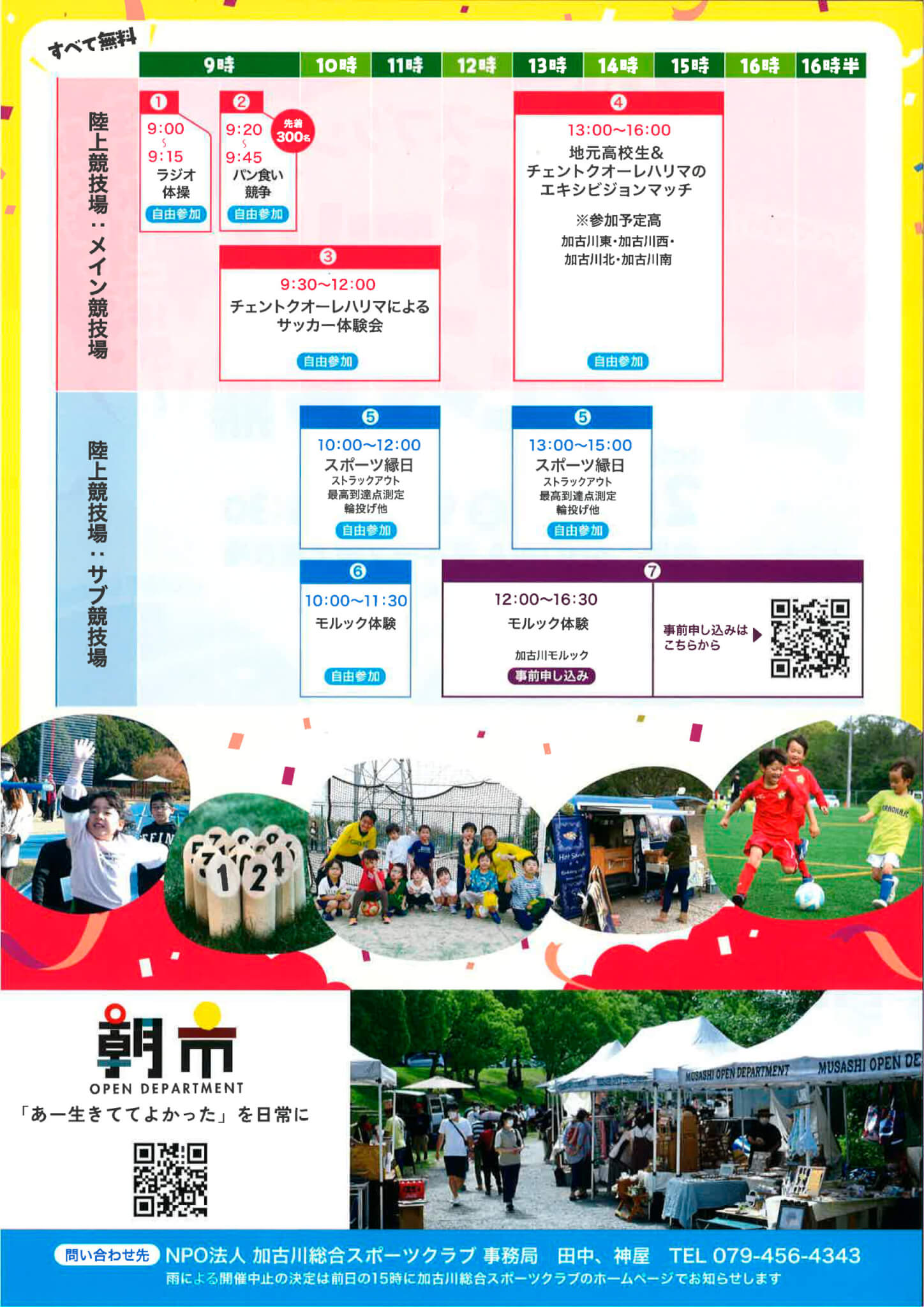 パン食い競争やスポーツ縁日、サッカー体験会、モルック体験などが楽しめます。ムサシオープンデパート朝市もコラボ開催!
