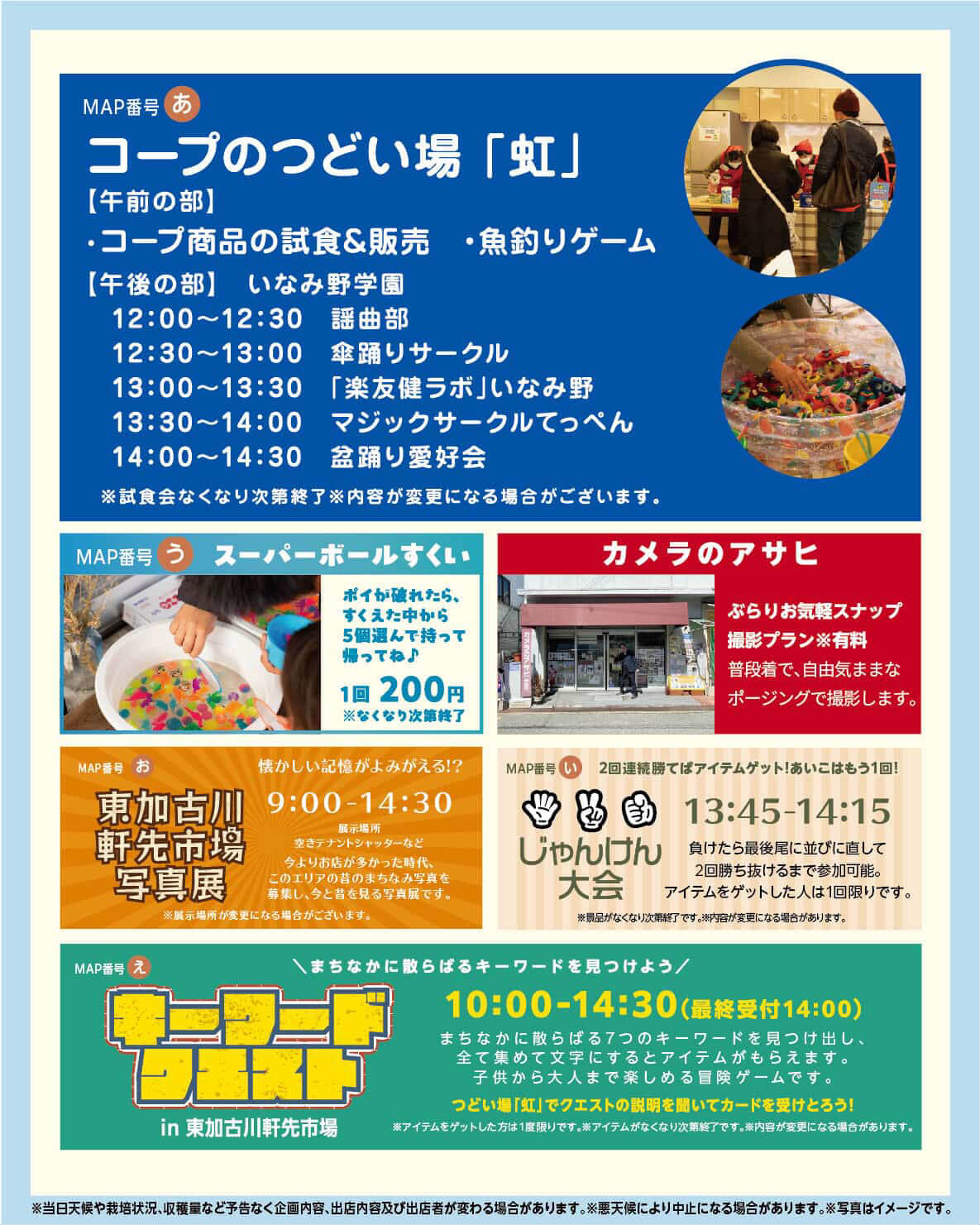 コープのつどい場「虹」では、コープ商品の試食&販売、魚釣りゲーム、いなみ野学園の演奏などが行われます。