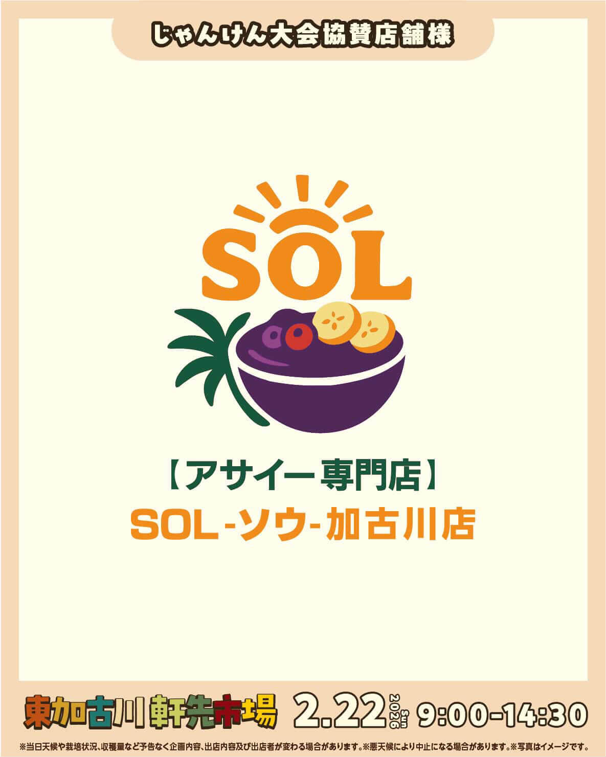 じゃんけん大会は協賛にアサイー専門店SOL-ソウ-加古川店が入り、駄菓子や珈琲、アサイー割引チケットなどのアイテムがゲットできます!