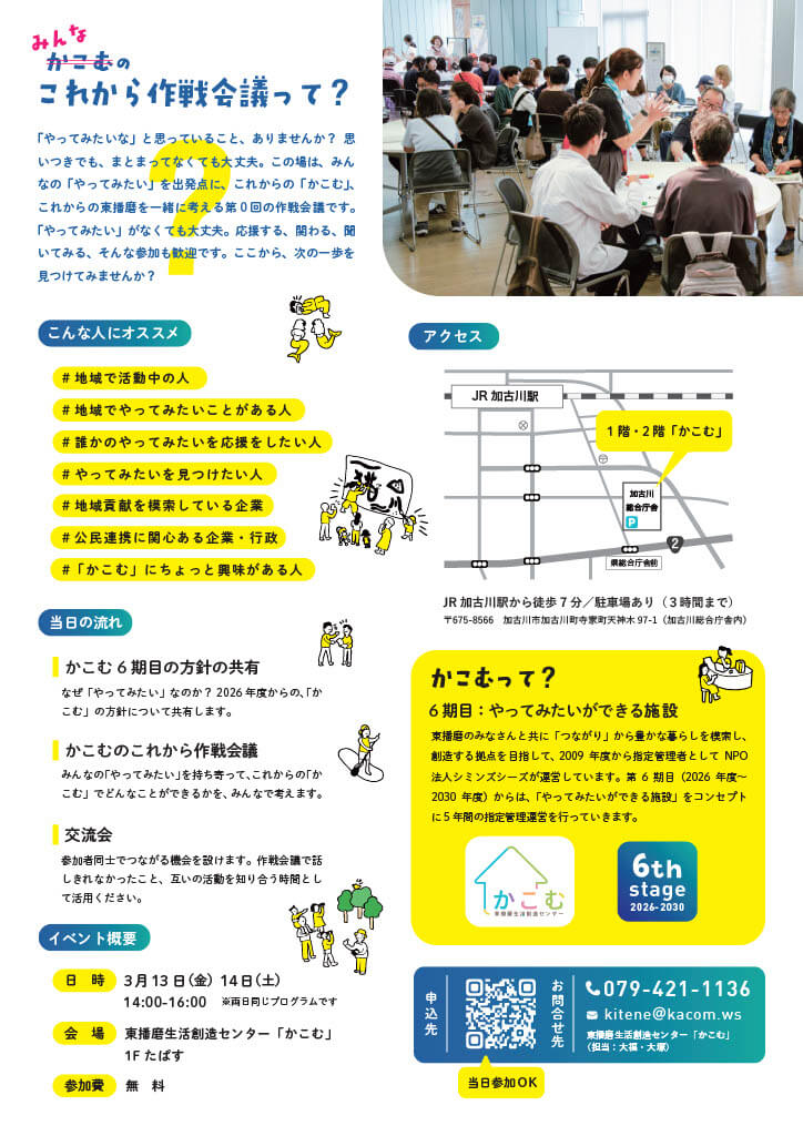 みんなの「やってみたい!」を持ち寄って、これからの「かこむ」、これからの東播磨を一緒に考える第0回の作戦会議です!