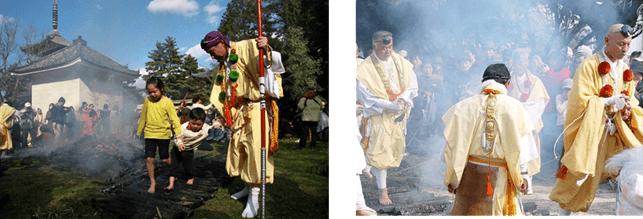 終了後には炎の残る壇木を並べて、その上を裸足で歩いて渡る「火渡りの儀」を体験できます!