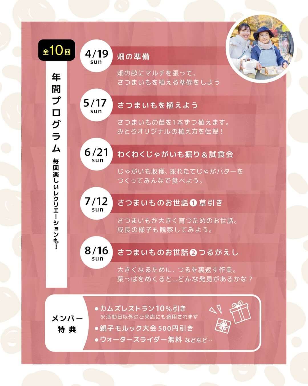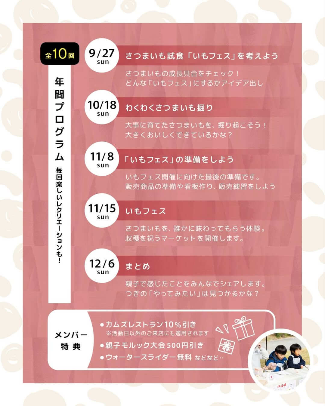 このプログラムの一番の魅力は、春の畑づくりから秋の「いもフェス」まで、ひとつながりの体験ができること。