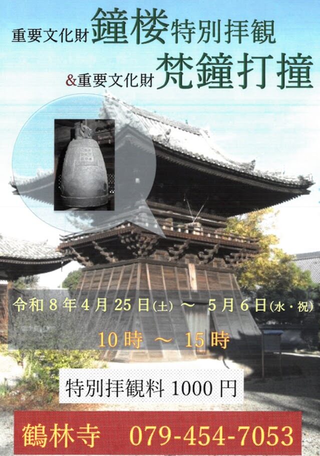 2026年4月25日(土)から5月6日(水・祝)のゴールデンウィークの期間、鶴林寺にて重要文化財の鐘楼の特別拝観&同じく重要文化財の梵鐘打鐘が開催されます! 開催時間は10時から15時。