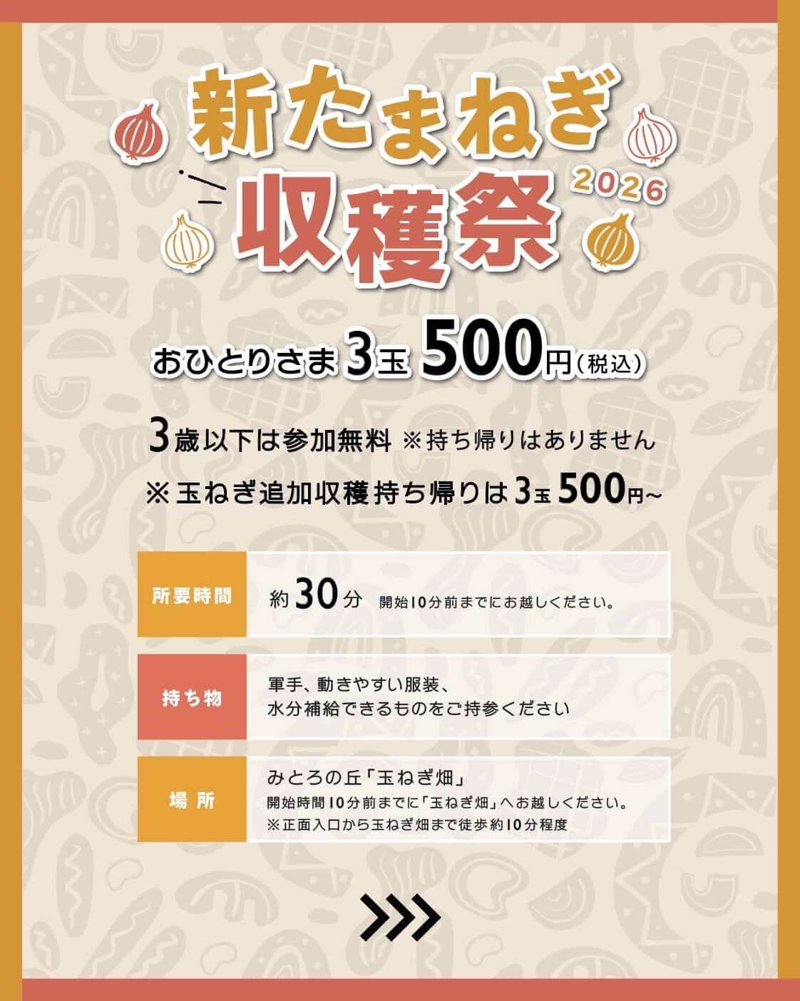 開始時間の10分前までに玉ねぎ畑に集合です。玉ねぎ畑までは入口から徒歩約10分かかるそうなので、時間に余裕を持って来場ください!