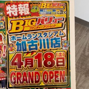 BIGバリュー ホームランスタジアム加古川店が4/18(土)朝10時オープンと判明しました! 3店舗合同グランドオープンセールも!