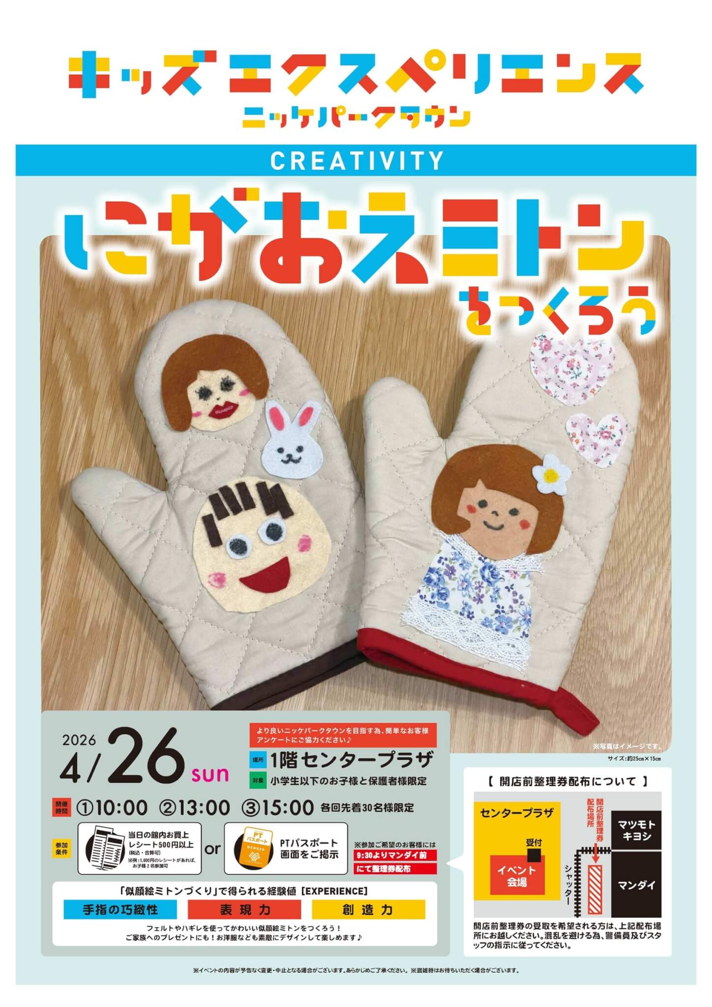 4/26(日)キッズエクスペリエンス にがおえミトンをつくろう at ニッケパークタウン