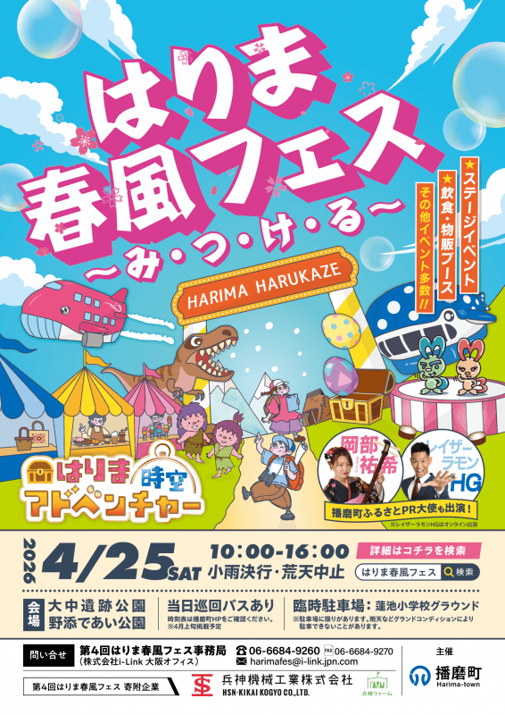 10時~16時。播磨町ふるさとPR大使の岡部祐希さんの出演、レイザーラモンHGさんのオンライン出演も予定されています! イベント多数、出店多数の播磨町の春の定番イベントです!