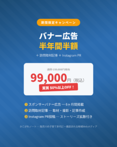 現在、かこがわノートのバナー広告と取材記事がセットでお得なキャンペーン開催中です。半年間半額で加古川市民にアピールできますので、お店の方も会社の方もこの機会にぜひ!