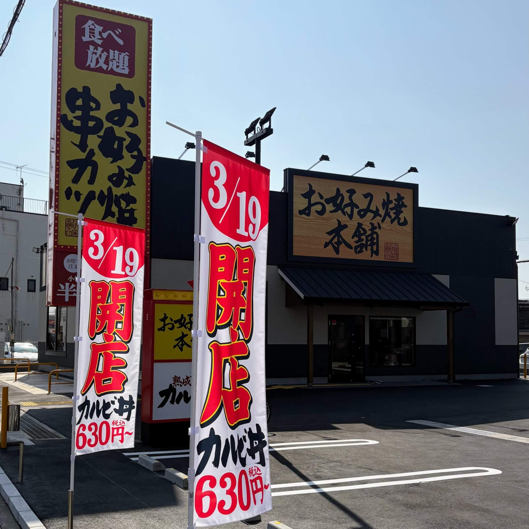 先日、同じ敷地内の焼きたてのかるび東加古川店は3/19(木)オープン予定とお伝えしましたが、お好み焼本舗の店頭に開店日を書いたのぼりが立っていました!