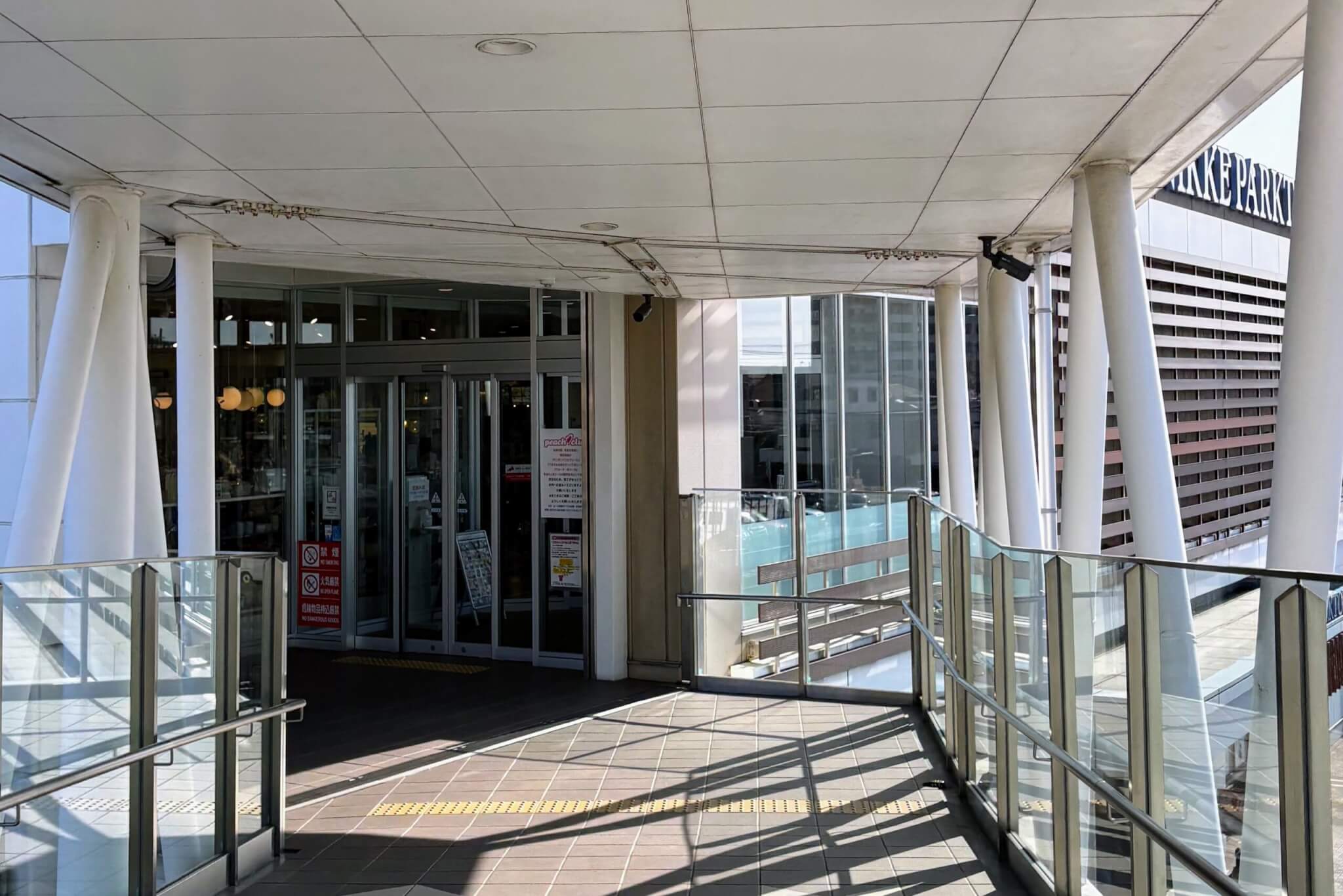 スターバックスやTSUTAYAのあるミーツテラスにつながる2階通路の出入口すぐの場所です。