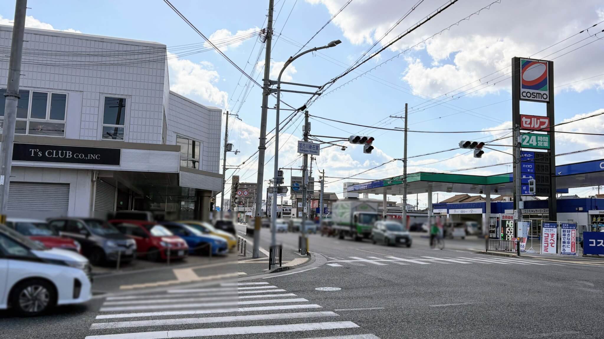 国道2号線の加古川新在家交差点南東のコスモのセルフガソリンスタンドの東隣です。