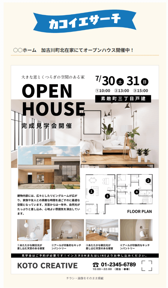 掲載イメージは以下の形式です。【見出し(30文字程度)】【チラシや間取り図などの画像1枚】【物件情報URLへのリンク】が掲載可能です。
