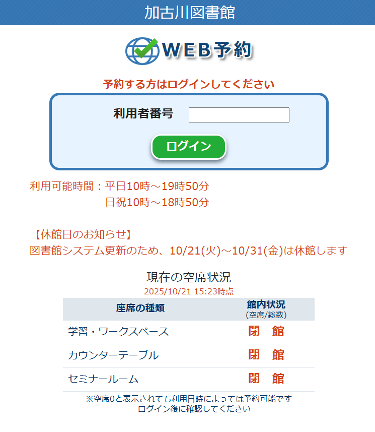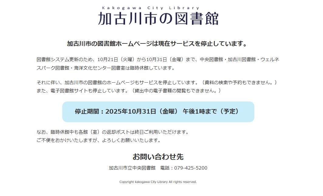2025年10月21日(火)から10月31日(金)までの期間、図書館システム更新作業のため、加古川市内のすべての図書館・図書室が臨時休館します。