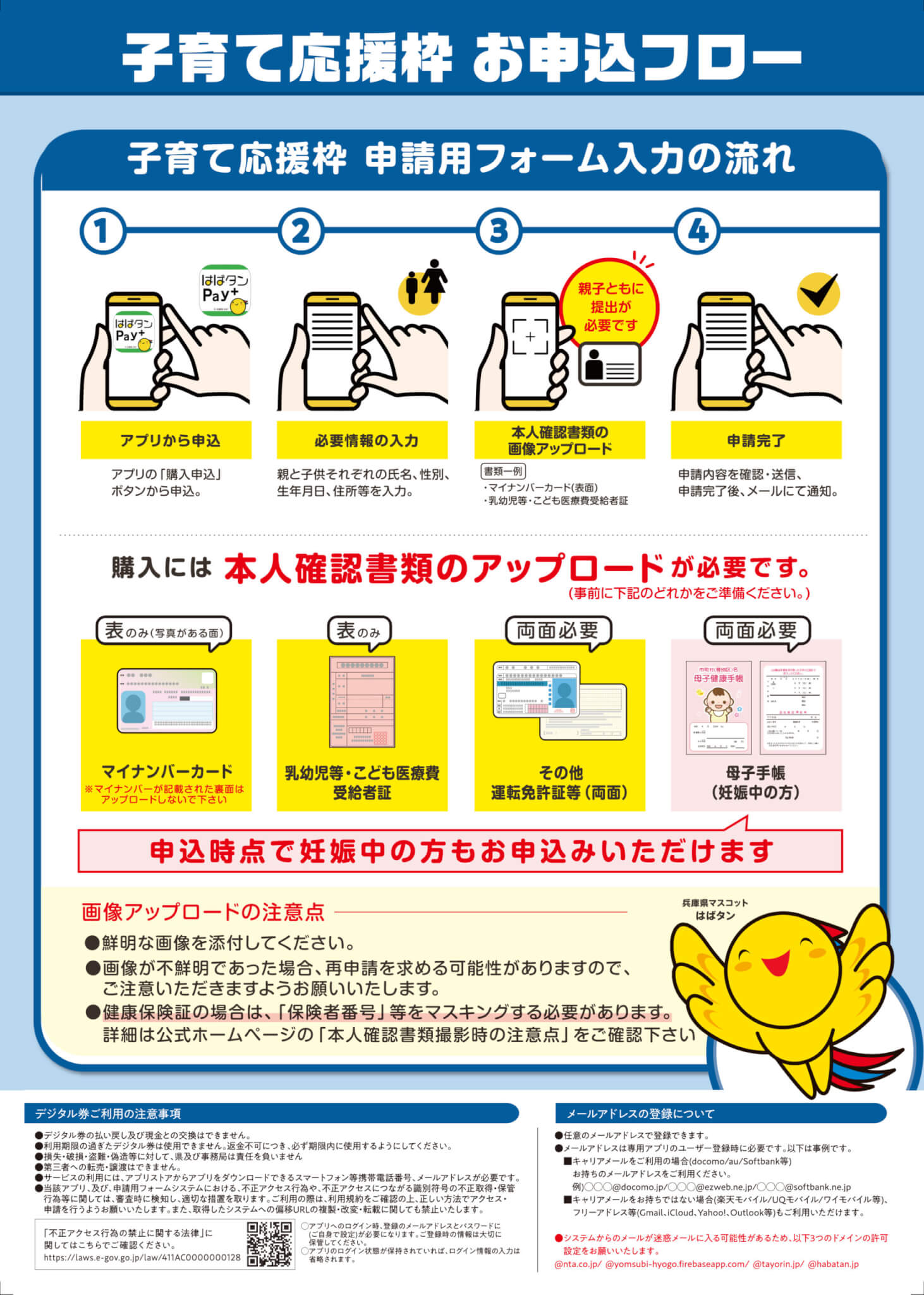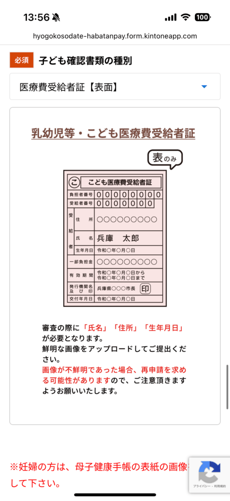 妊婦の方は、母子手帳(おもて面+住所記載ページ)をアップロードすれば申請できます。