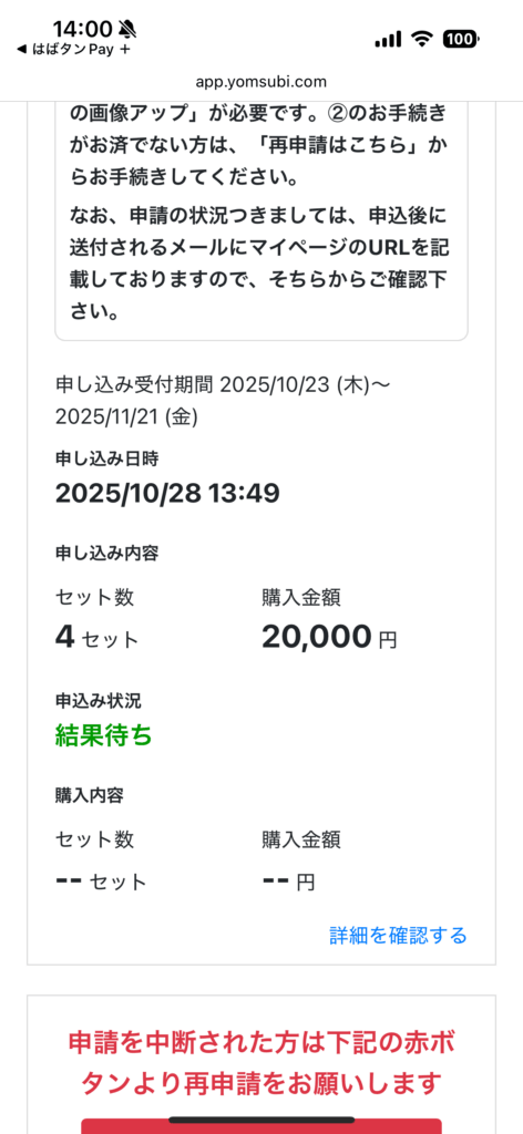 抽選結果案内は12月18日(木)に登録したメールアドレスに当落の結果が届き、12月19日(金)以降にアプリホーム画面の 「商品券抽選結果」より確認できます。これまでは追加予算などで、全員全口当選となっているので、今回もそうなるのではないかと思います。