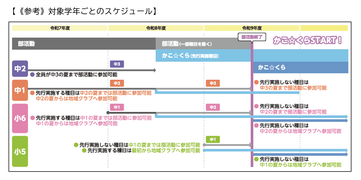 すべての部活動終了は令和9年(2027年)8月の予定ですが、先行実施種目は令和8年(2026年)8月に部活動が終了し、地域クラブ活動が開始します。