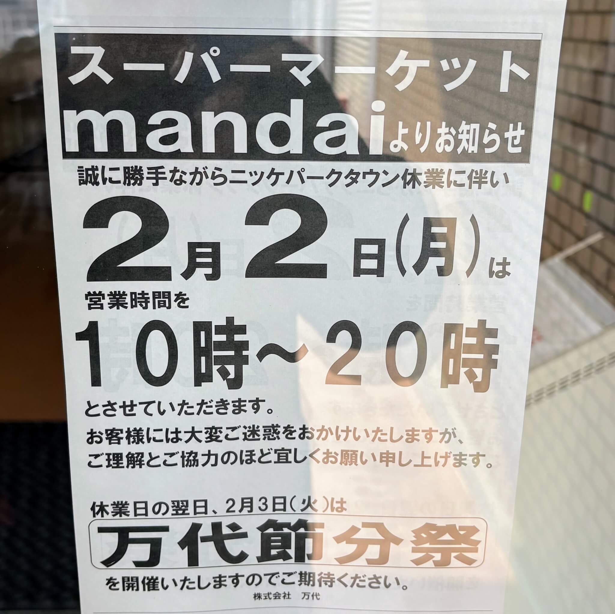 万代ニッケパークタウン店は、通常9時から22時までの営業ですが、2/2(月)は10時から20時までの営業時間に変更となります。