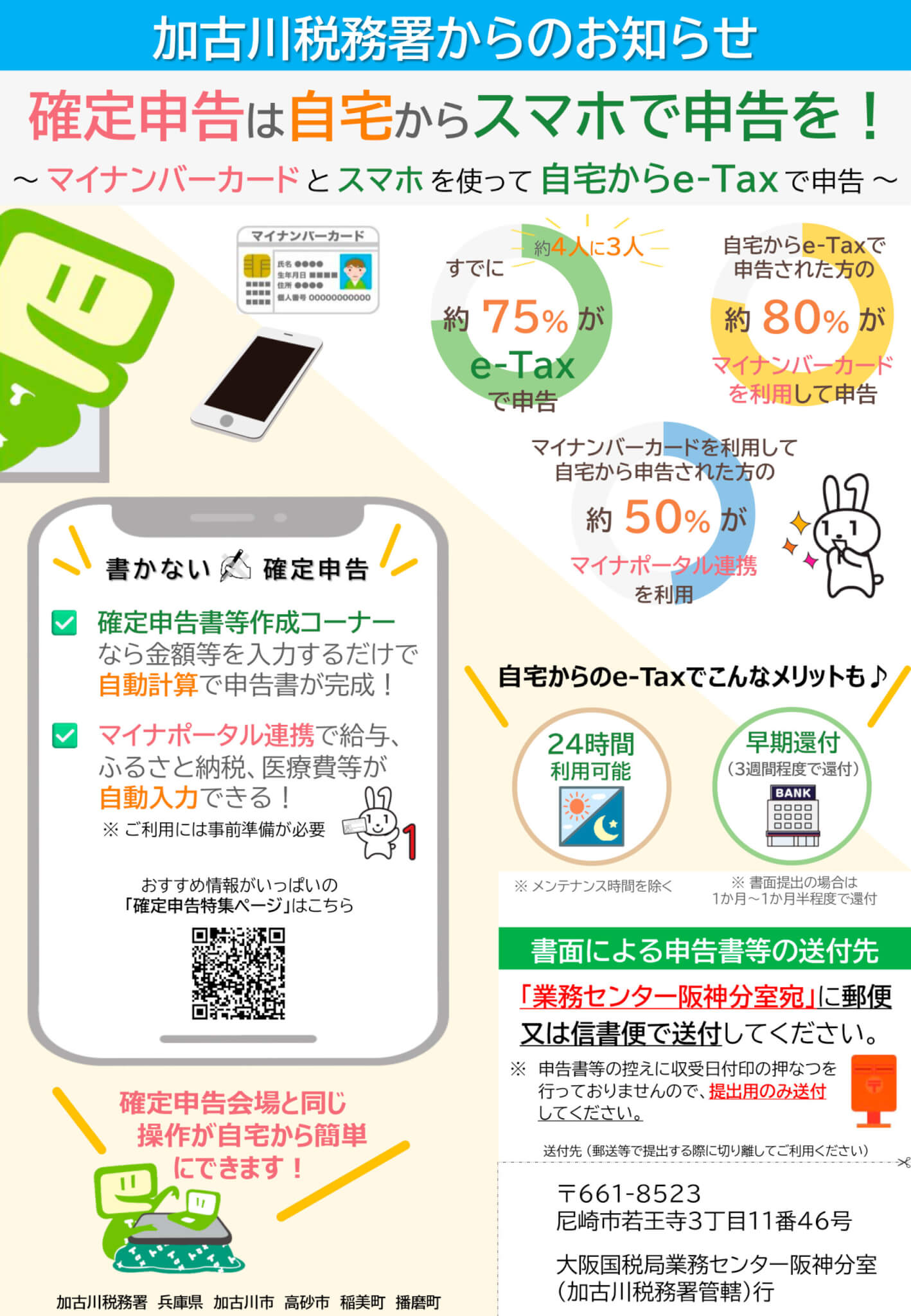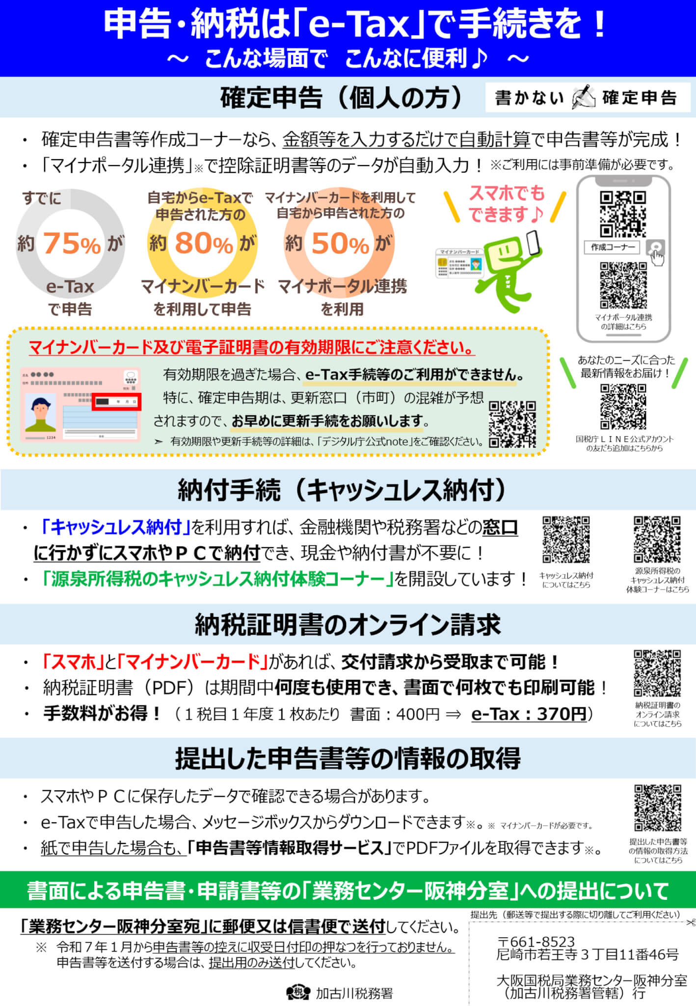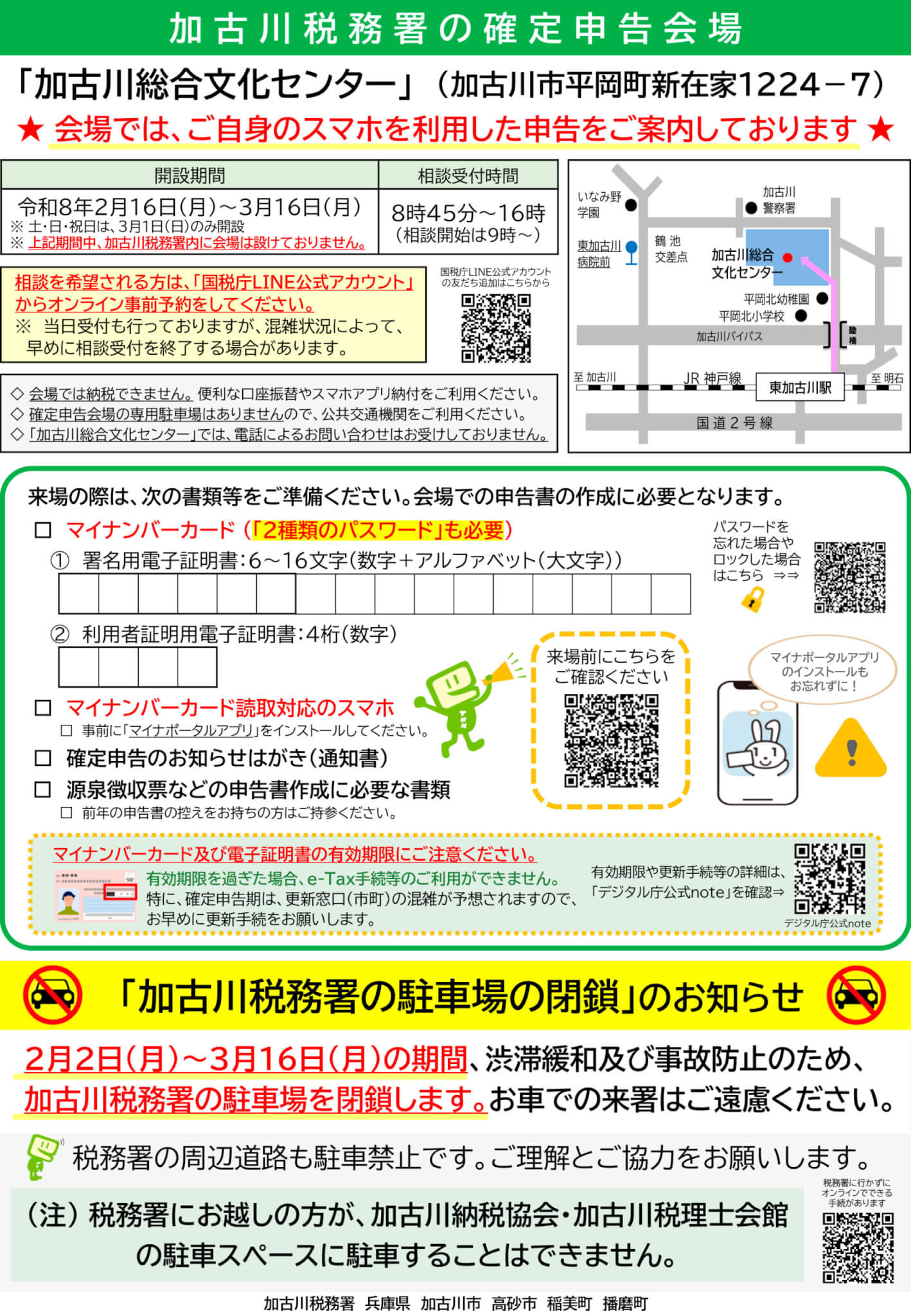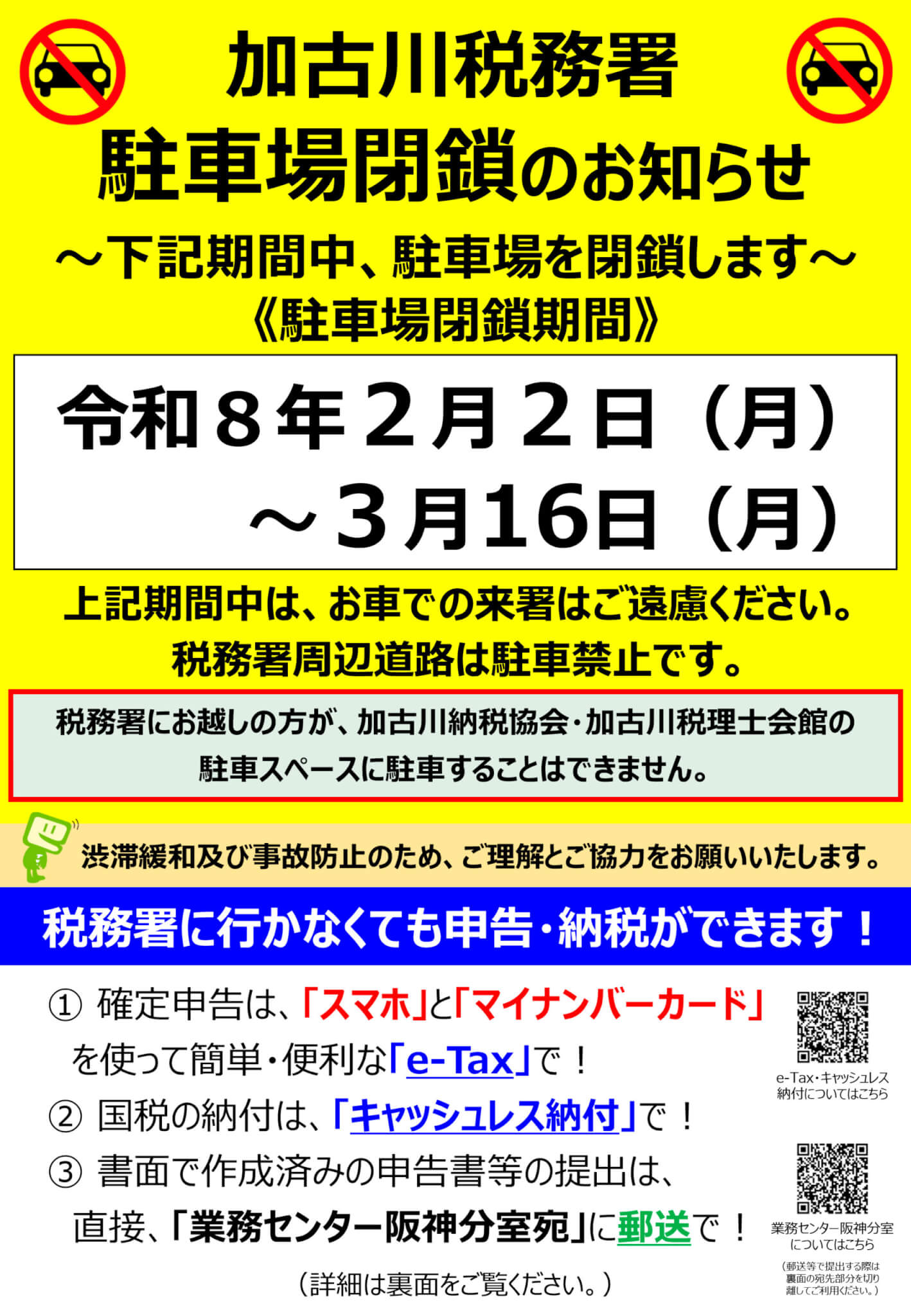 また、2月2日(月)から3月16日(月)までの期間、渋滞緩和及び事故防止のため、加古川税務署の駐車場は閉鎖されます。作成済みの申告書などは大阪国税局業務センター阪神分室に郵送してください。