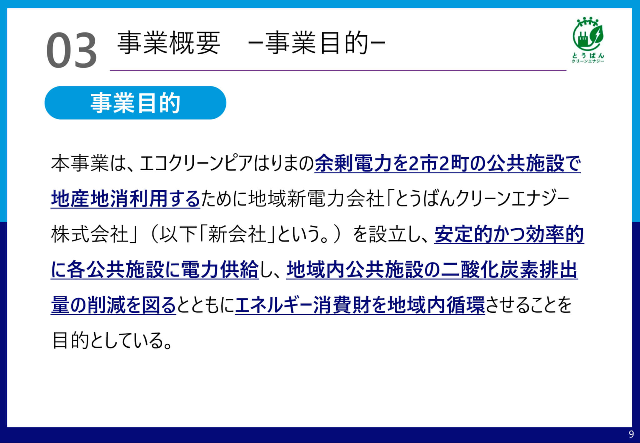 どういった会社かというと、2市2町で利用している広域ごみ処理施設「エコクリーンピアはりま」の余剰電力を2市2町の公共施設で地産地消するための会社です。