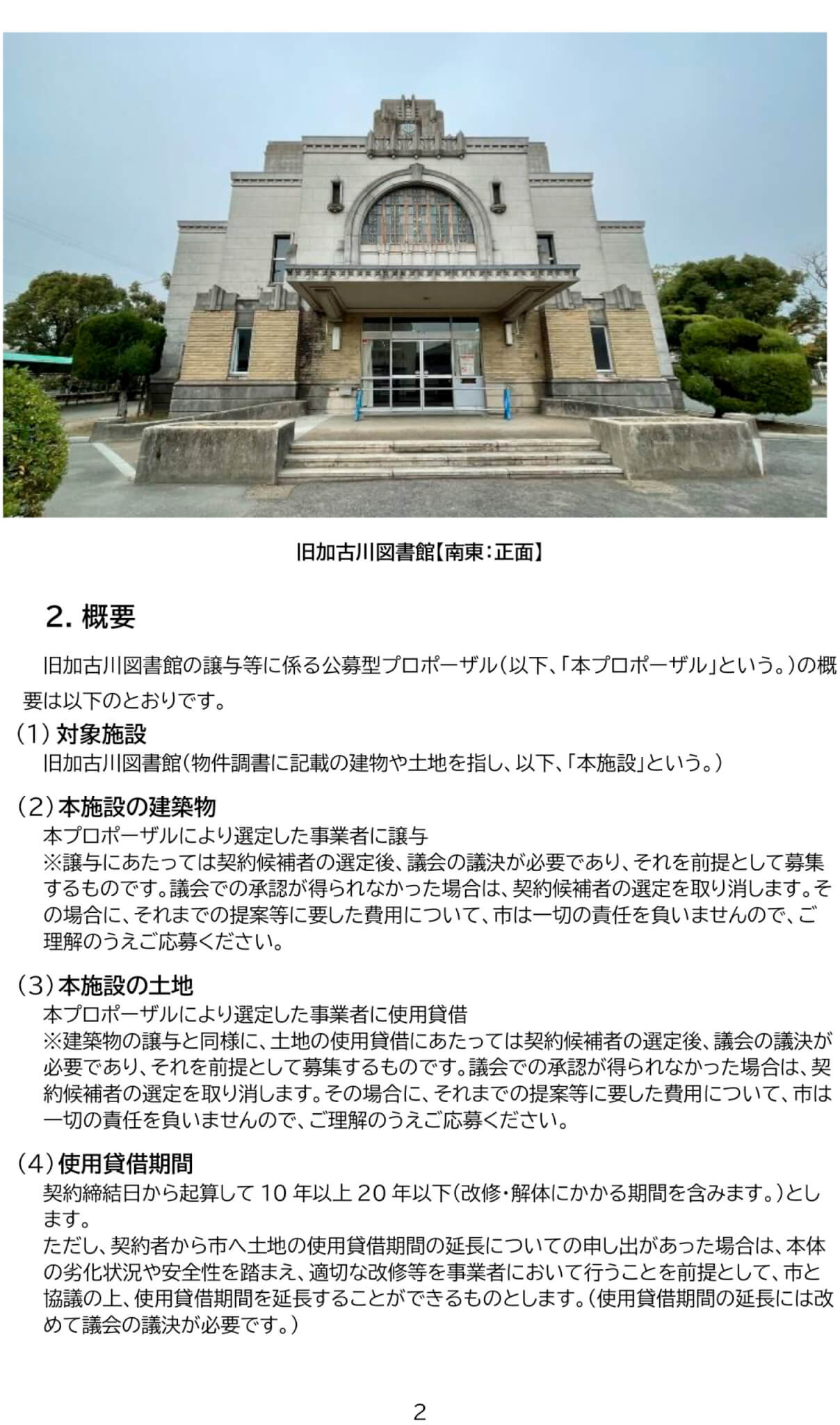 建物の譲与と土地の貸付: 選定された事業者には、図書館の建物が譲渡され、土地は10年以上20年以内の期間で無償貸付(使用貸借)されます 。使用貸借期間の延長も可能です。
