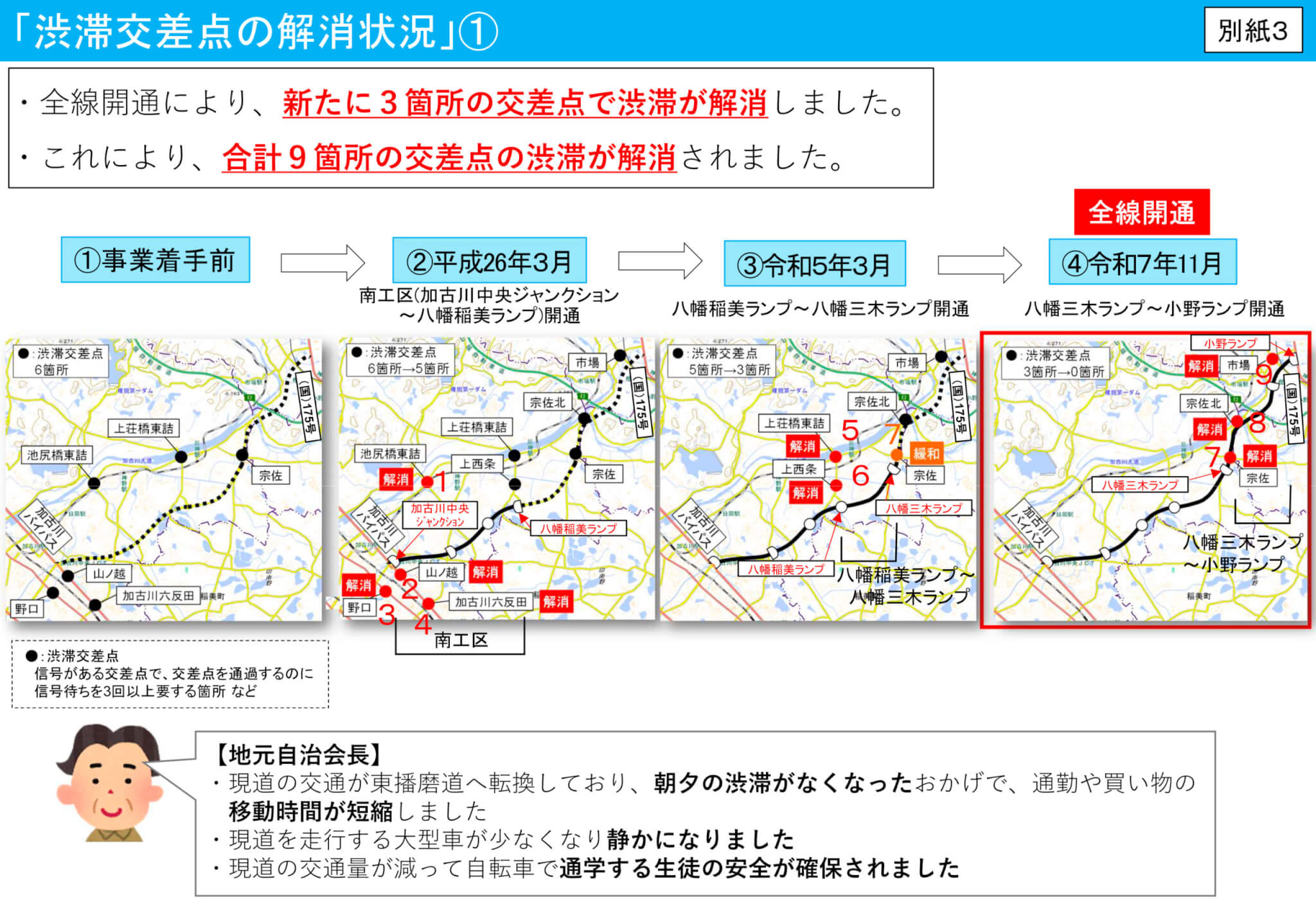 • 渋滞交差点の解消:全線開通により新たに3ヵ所の交差点で渋滞が解消し、東播磨道の整備により合計9ヵ所で解消されました 。