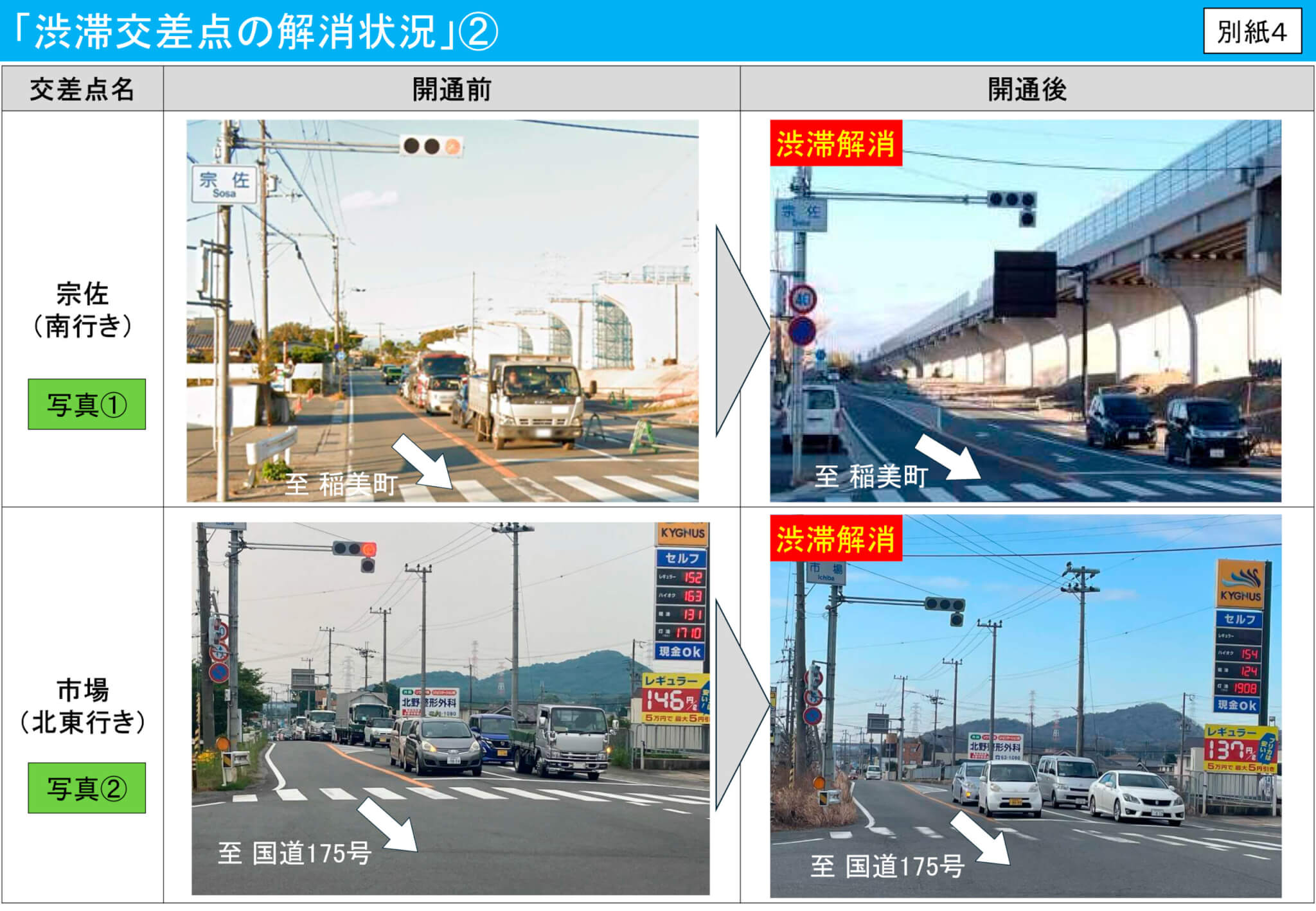 • 解消された主な交差点:宗佐、市場、上荘橋東詰、池尻橋東詰、野口など 。