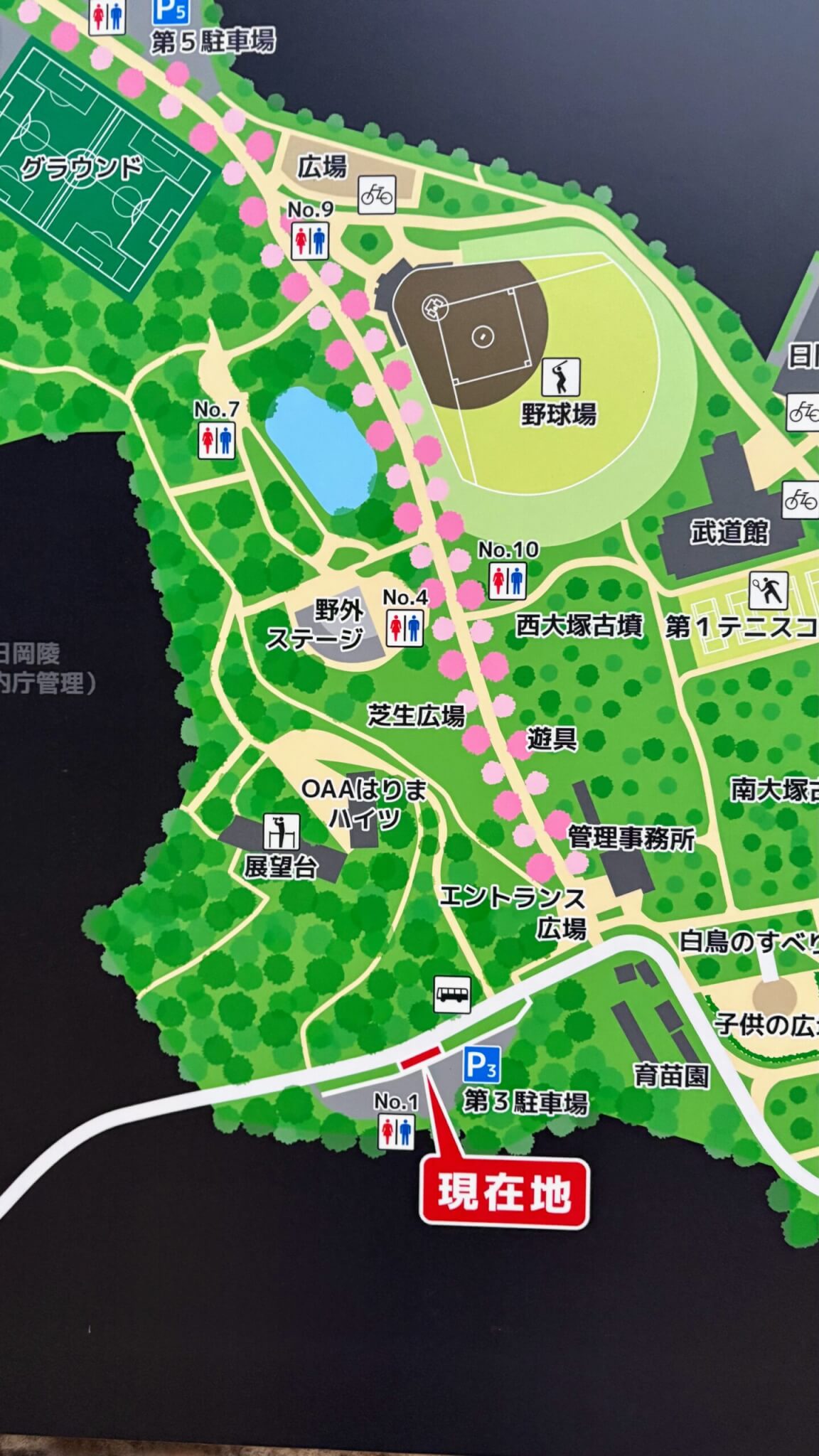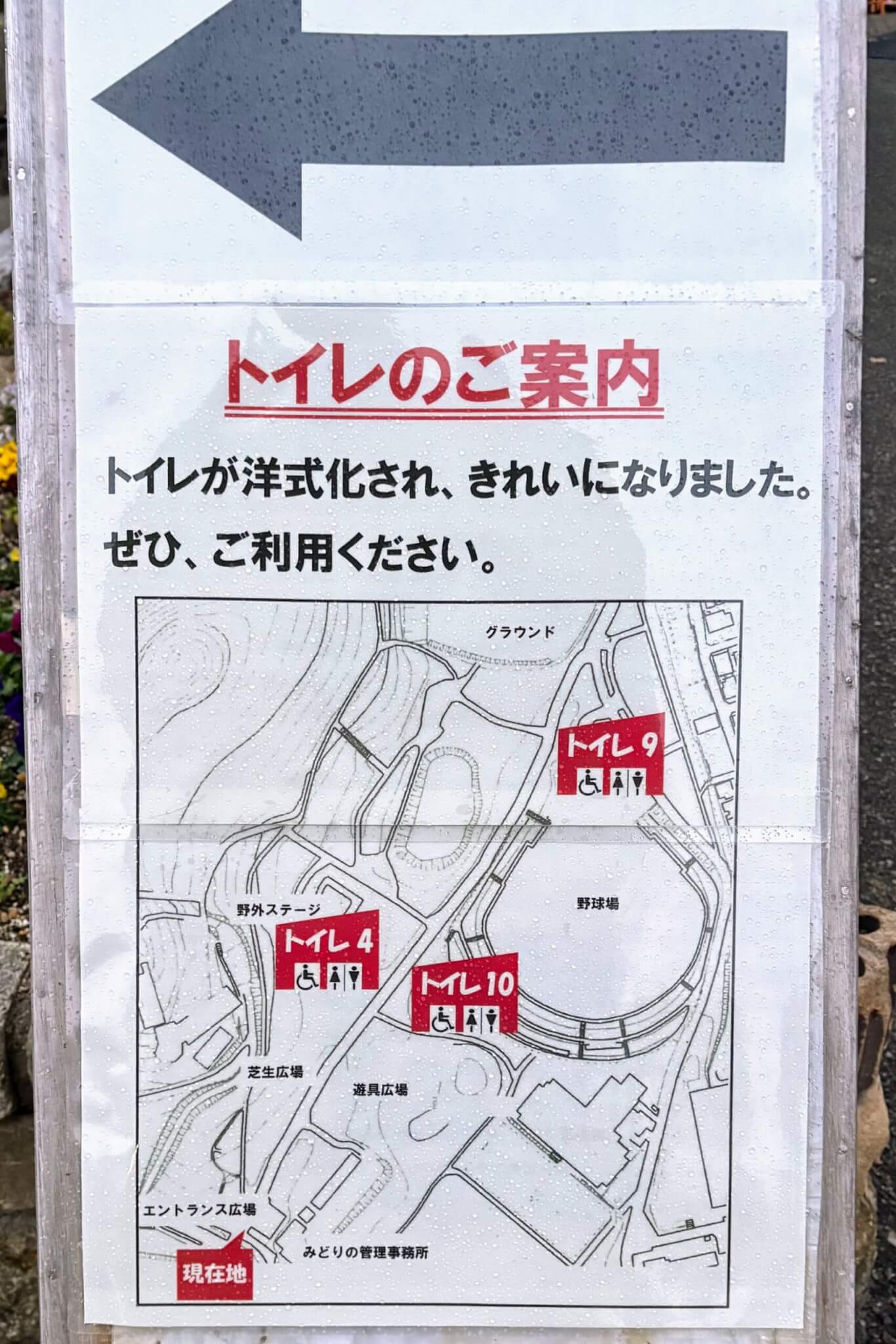 マップで見ると、10番がさくら並木の坂の上あたり、4番がそこで屋外ステージの方に曲がったところ、9番が野球場の入口付近ですね。10番は数年前から洋式化されていた記憶。